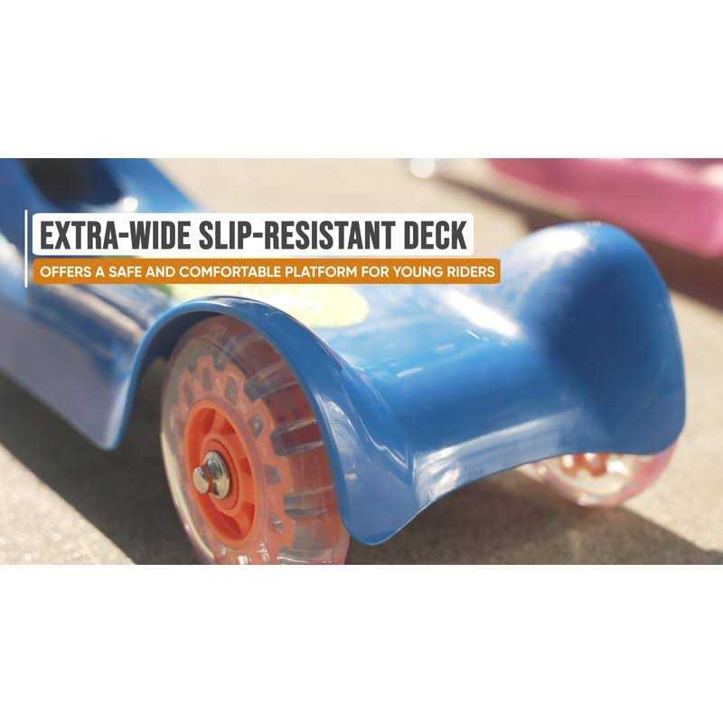 The folding kiddie kick scooter features a 3 wheel design and an extra wide slip resistant deck. Suitable for ages 3 and up. Maximum rider weight 44 lbs (20 kg).