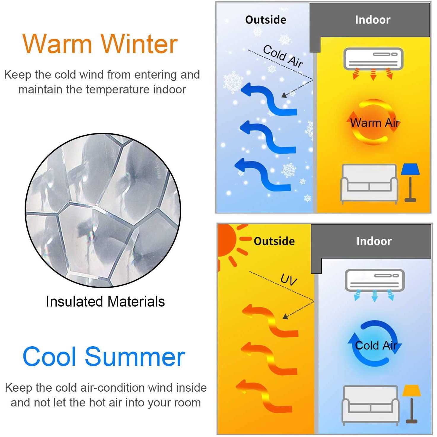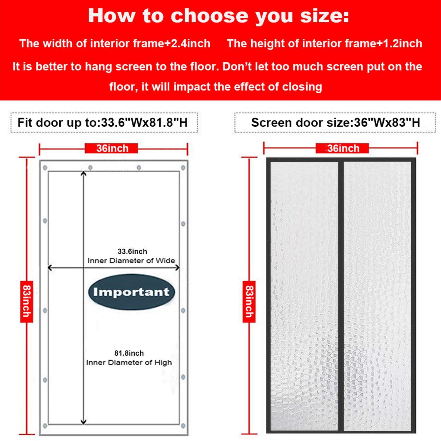 Package included: 1x Door Curtain 1x Roll of Magic Tape 1x Box of Push Pins 1x Installation Tool 1x Instruction0.15mm Thickness Environmental Protection PVC low temperature resistant,-40 degrees in winter without deformation or broken36 Powerful Magnets 36 upgrade version strong magnets are sewn in the middle of the curtain to achieve a seamless closing,and avoid noise when you go through the door curtain4 Gravity Sticks 4pcs gravity sticks are added in the bottom to prevent door curtain from being blown away by the windFull Frame Magic Tape Design Super strong magic tape around every inch along the top and both sides,avoid dropping and enable you to remove the door screen any time.Semitransparent White Giving a misty beauty,light transmittance up to 60%,not only bring ample natural light down into the interiors,but also enhance privacy! Advantages of Thermal Insulated Door Curtain Keep warm in winter,and keep cool in summer Prevent air conditioning loss, save energy and electricity Can be used in the kitchen,preventing cooking odors from spreading in the rest of the house. Can be used as a temporary door suitable for main entrance doors,offices,stores,patio,deck,porch,balcony,glass,garage,sliding doorsWarm Trips: 1. Measure your door first, choose the size that fits your door. Dont buy the one which is smaller than your door. 2. Please make sure the center of the top mesh slightly higher than two sides. It is better to hang screen to the floor. Dont let too much screen put on the floor, it will impact the effect of closing
