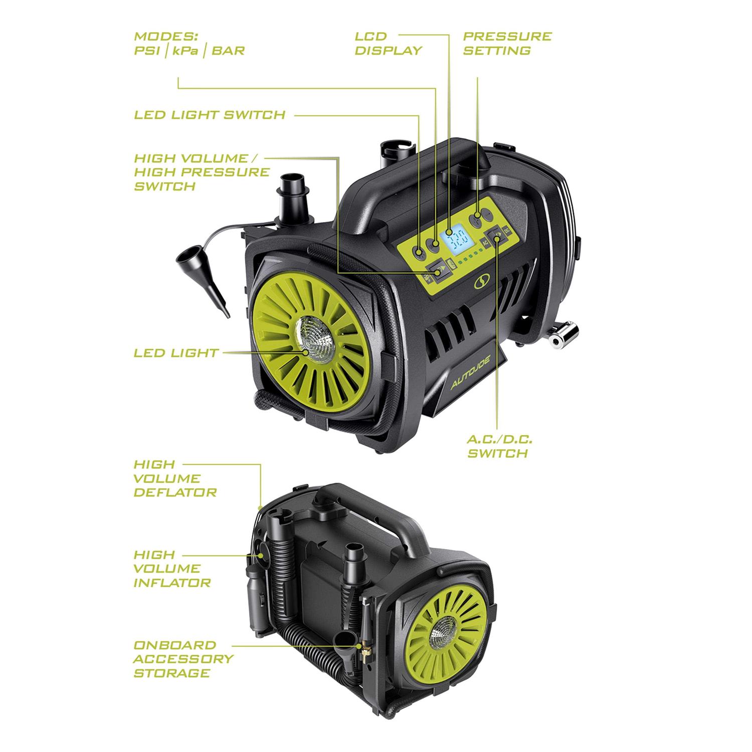 Auto Joe Hybrid 12-Volt/110-Volt AC High-Volume Tire Inflator/Deflator w/ Digital Pressure Gauge & Attachments