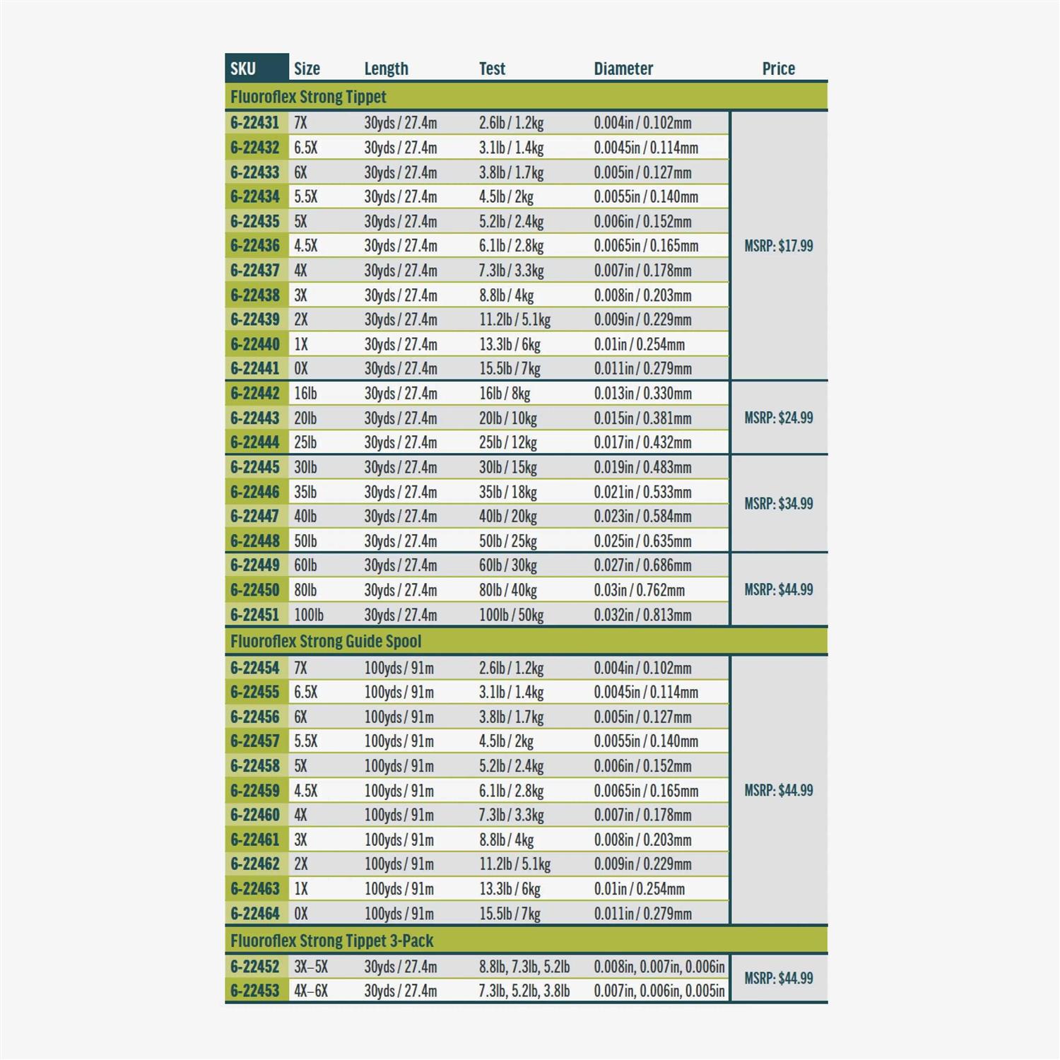 RIO’s newest tippet material is an ultra-strong, 100% fluorocarbon with exceptionally high tensile strength. The material is very easy to tie knots in, with high knot strength and a smooth finish that ensures knots seat easily and tightly. The high break strength to diameter ratio makes this a fantastic fluorocarbon for the trout fly fisher. RIO is proud to introduce half size of core trout diameters, giving anglers an extra choice when faced with the decision to choose between, say 4X and 5X. Our new 6.5X, 5.5X and 4.5X sizes will make those decisions easier. Each Guide spool has 100 yards of top quality material spooled on.