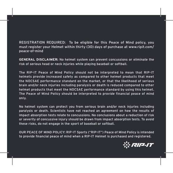 Nothing should hold you back. Not fear. Not doubters. Not opponents. And definitely not your softball gear. So step up to the plate and swing with unwavering confidence. Wider field of view for better visibility and better peripheral vision than any other fastpitch helmet. Blackout Technology coating inside face mask bars to eliminate distracting glares. Moisture-wicking padding to manage dampness and reduces irritation with a comfortable fit. Dual-layer padding adds protection and form-fitting comfort. Well constructed shell with 21 strategically placed air vents to keep you cool throughout all those summer games. RIP-IT’s Peace of Mind Policy gives you the confidence that this helmet will protect you as the competition increases. RIP-IT Softball Helmet is SEI certified to meet NOCSAE standards.