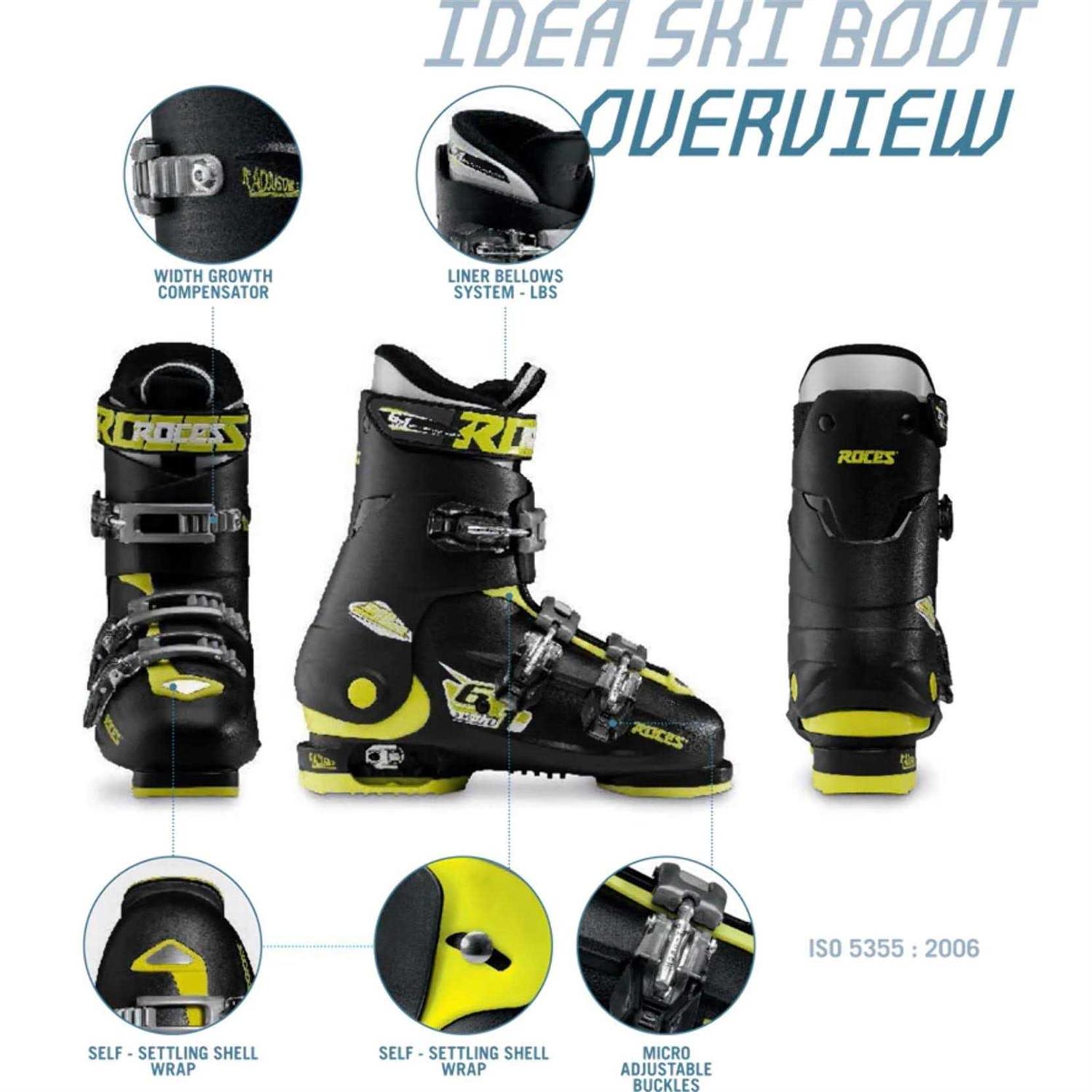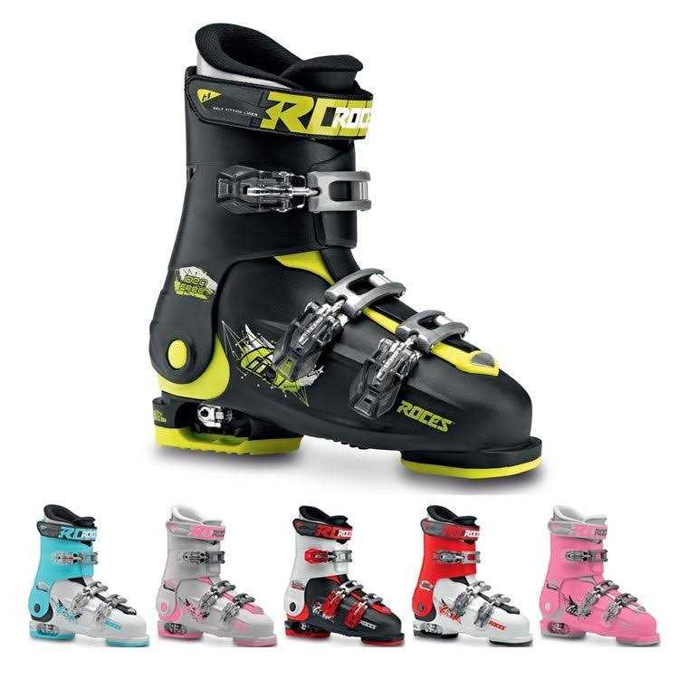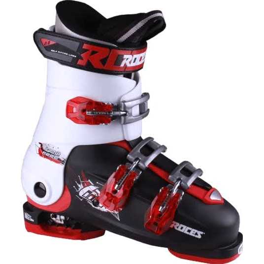 Boots by Roces. Details:The Idea Free adjustable ski boots can be tightened or loosened with a special crank mechanism in the heel to accommodate 6 sizes. Instead of buying new boots every year for your children, you can now get one pair of Roces that will last your growing child for a few seasons. This new design features a power strap for better stability and responsiveness when skiing, an innovative easy entry system, and improved heat conservation features. These youth boots are also super comfortable and are a great option for children with wide feet. All in all, Roces is committed to making skiing a fun, affordable and comfortable experience for kids and their parents.