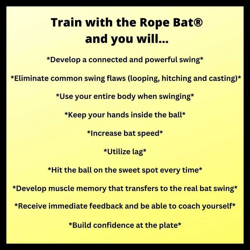 Prepare for a Corrected, Connected & Perfected Swing! The Rope Bat forces hitters to swing with correct swing mechanics while eliminating swing flaws and developing greater speed, power, accuracy and consistency.