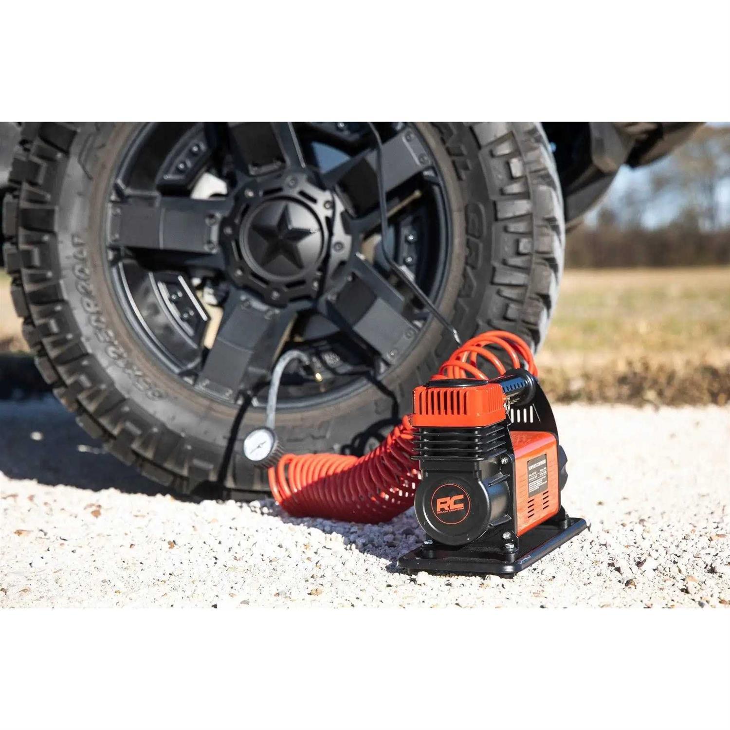 The Rough Country RS205 portable twin air compressor is the perfect tool when dealing with underinflated tires or struggling to maintain optimal tire pressure during your outdoor adventures. The 12 volt air compressor conveniently comes with power harness, switch harness and switch.