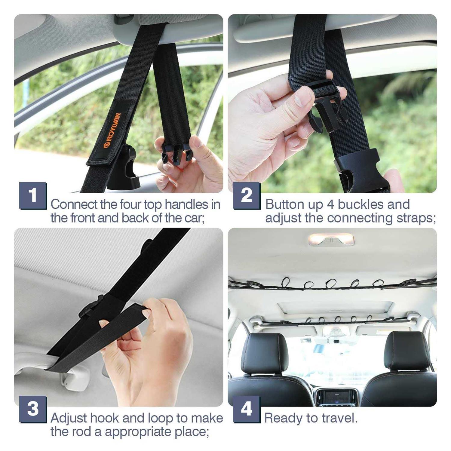 DURABLE HARDWARE – Fishing rod holder straps are made of high quality polyester, which are strong and durable, wear-resistant, difficult to tear and provide a long service life. In addition, they can firmly fix your fishing rods. ADJUSTABLE STRAPS – The belts are designed to be adjustable and are widely used in vehicles with four handles on the top, such as trucks, SUVs and vans. Besides, they can be adjusted between 30″ and 54″. STORAGE ACCESSORY – They can hold up to 5 fishing rods. The adhesive straps can not only help you store the fishing rods in an orderly manner, prevent the various rods from tangling or knotting, but also prevent them from moving and ensure you and your passengers’ safety. SPACE SAVING – When you drive to go fishing outdoors, the objects you carry will occupy most of the space in the car. These straps can help you take advantage of the space on the roof to store the fishing rods, saving you more space. EASY INSTALLATION – The buckle design at both ends of the straps makes it easy to install them on the four handles of the car roof, and no additional tools are needed to complete the installation quickly and effortlessly.