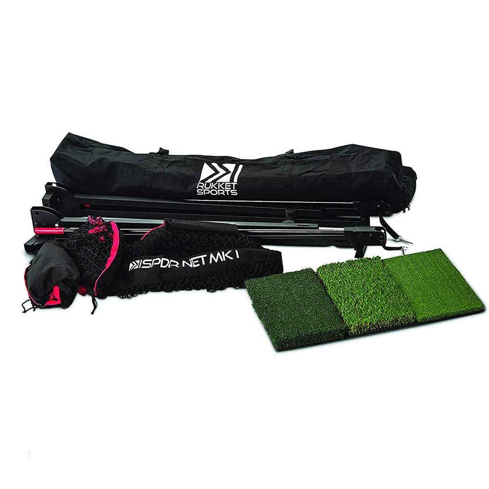 SPDR: Self Contained Portable Driving Range (10ft x 7ft) The Self-contained Portable Driving Range: 10 feet wide by 7 feet tall the Rukket Sports top of the line golf net features a fully folding top of the line frame that keeps the net on when its packed away. Setup Once, Ready-To-Go Anytime No loose pieces that have to be assembled after initial set up. The SPDR net includes a 3 turf folding mat and side barrier netting for added protection where ever you choose to use your net. Each side net can be staked to the ground or weighed down using the pockets on each end. Ball Return Feature – Use Only One Ball! Ball return makes sure that you are no longer stopping to pick up multiple balls or having to carry a bucket for backyard practice. Practice with confidence using the most versatile and practical golf net available today. Unbeaten Quality The SPDR net frame is made with an outdoor rated powder coated finish. The legs fold in with the push of a button and side arms fold down using attached locking pins. Net fits into a 4ft long heavy-duty carrying bag.
