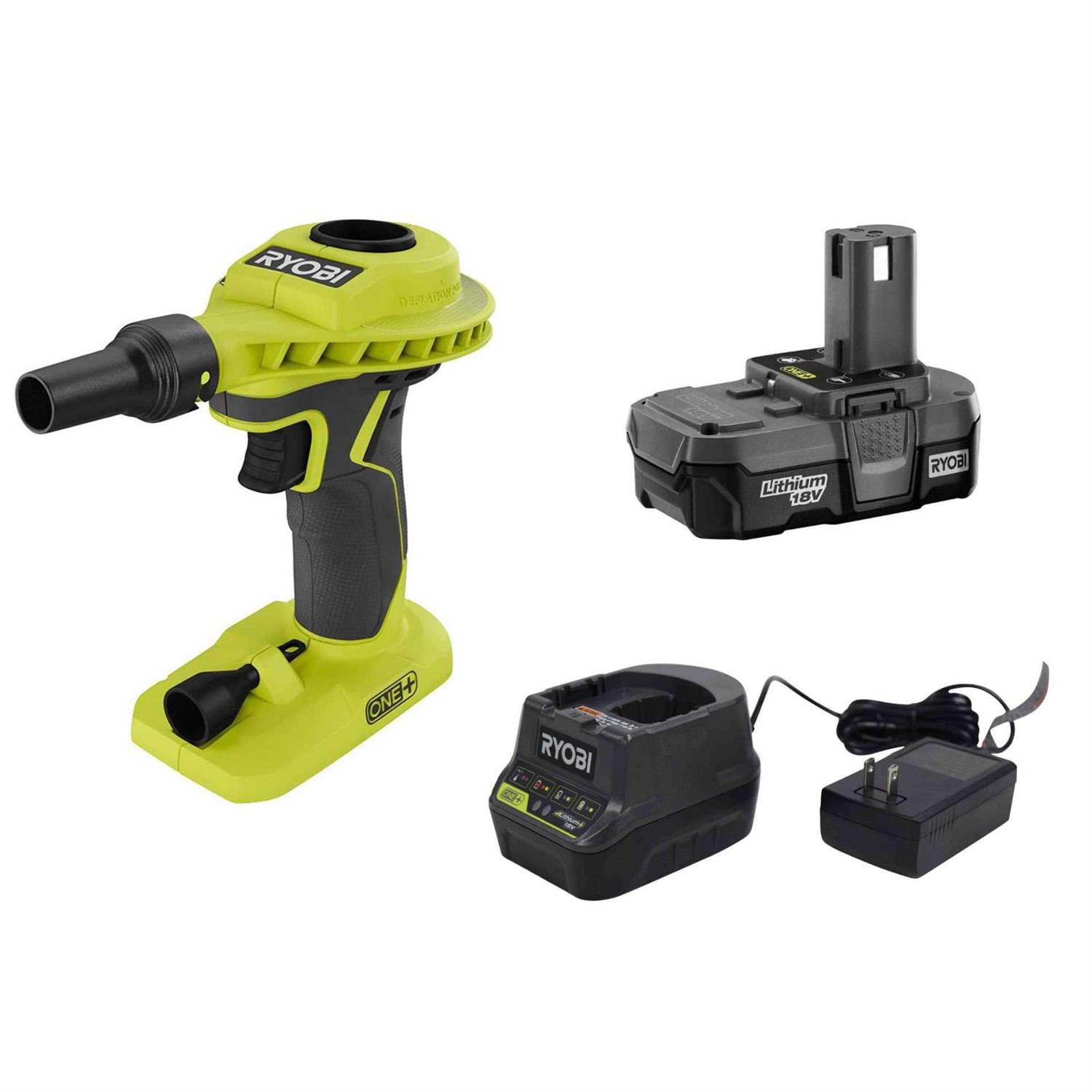 This cordless tool is perfect for fast, high volume inflating and deflating of air mattresses and pool toys. It can inflate a standard twin air mattress in 45 seconds. This tool is not just limited to inflation and deflation, it can also be used as a portable benchtop blower to keep your work surfaces clean from sawdust or debris and it can accelerate charcoal readiness time on your grill by providing high volume oxygen where you need it. The pistol grip handles with GRIPZONE overmold to provide user comfort as well as a locking trigger feature that prevents user fatigue. These features will help you power through any job effortlessly. The RYOBI 18-Volt ONE+ High Volume Power Inflator is a great addition to your ONE+ collection. Best of all, it is part of the RYOBI ONE+ System of over 175 Cordless Tools that all work on the same battery platform. High volume low pressure inflation and deflation for air mattresses Pinch valve adaptor for pool toy inflation Use as a portable sweeper for work surface clean up Pistol grip handle with GRIPZONE overmold Locking trigger feature to prevent user fatigue Powered by any RYOBI 18-Volt ONE+ Battery Part of the RYOBI ONE+ System of over 175 Cordless Tools