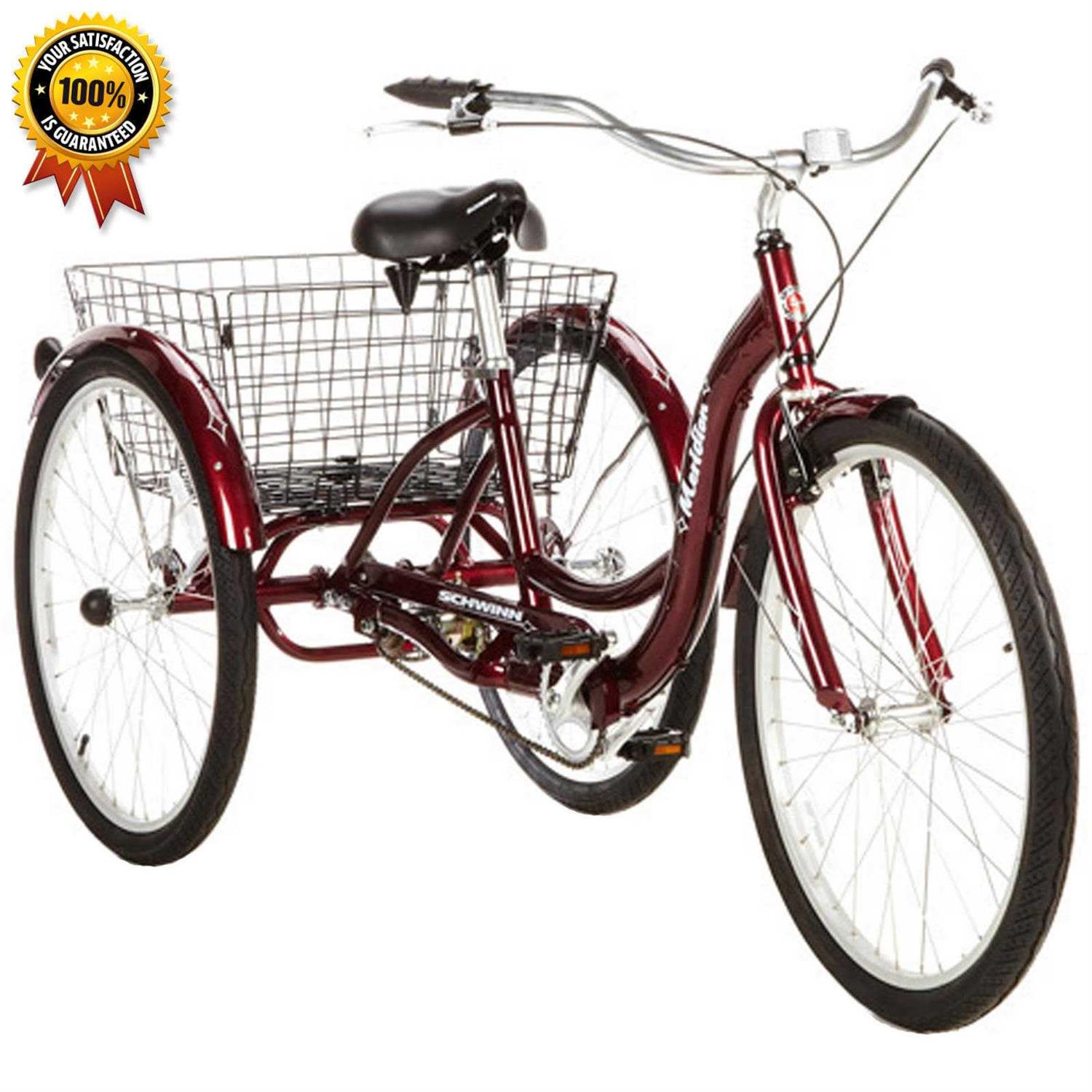 Experience a new kind of freedom while cycling on this Adult 26″ Schwinn Meridian Tricycle. With a low stand-over, easy step-through aluminum frame and rear folding basket, this dark cherry adult tricycle can safely and smoothly get you where you need to go. With a comfort saddle, inclusive storage and an easy to operate single speed design, the Adult 26″ Schwinn Meridian Tricycle is sure to become a commuting favorite.