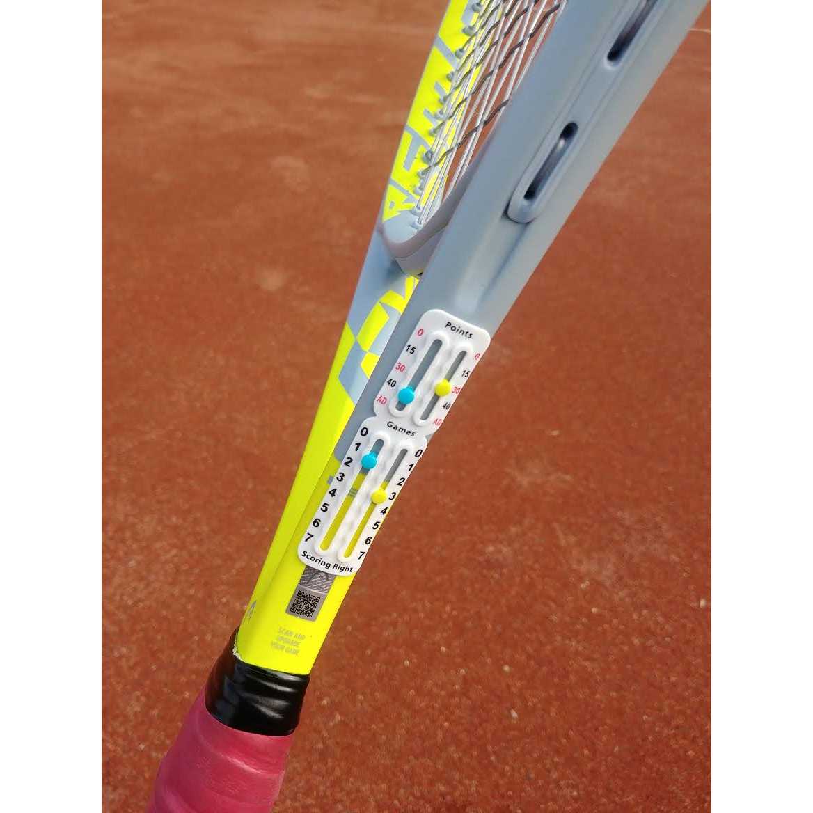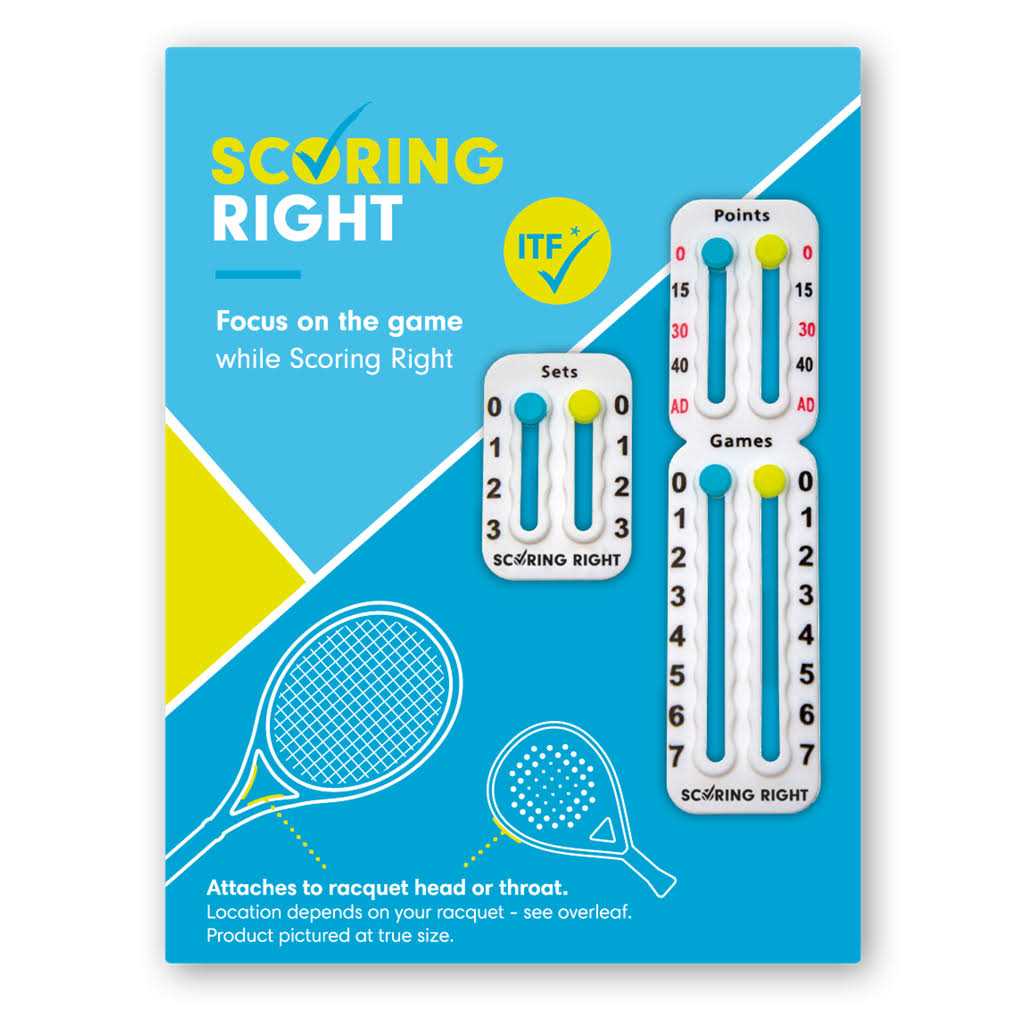 Scoring Right is the most comprehensive personal tennis score keeper. Know the score at a glance and never forget from which side of the court to serve. Scoring right attaches to the inside or out side of your racquet throat. Weighing less than 1.9g Application Instructions: Clean area with alcohol. Allow to dry completely before application. Pull back adhesive protection and gently position on racquet for perfect fit. Firmly press and hold while maintaining pressure for 30 seconds. Allow adhesive to set (within 2 hours) before use. Bond strength will increase with time. Scoring Right is the first and only ITF conforming racquet attached score keeper.