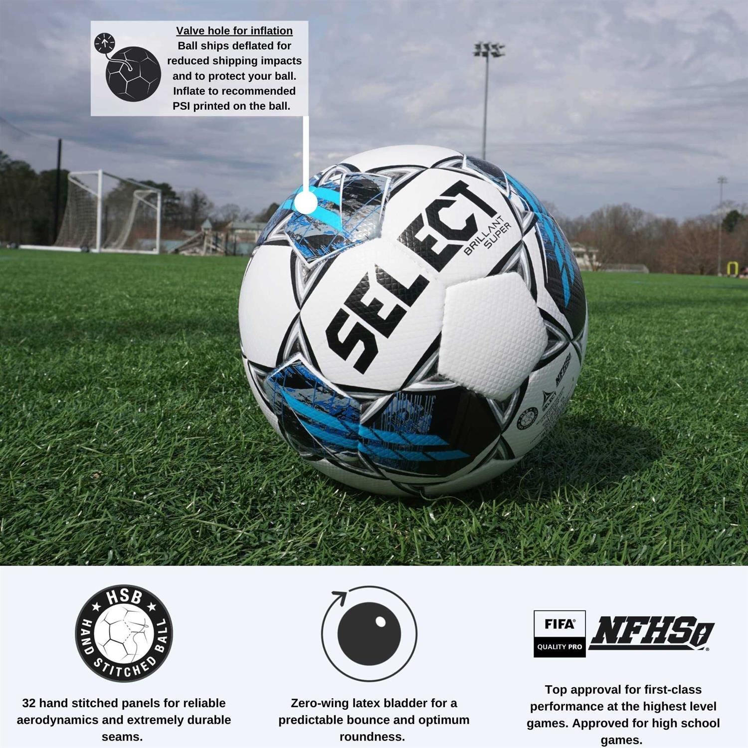 Bundles of 10 Balls The soccer ball is hand stitched and manufactured using high quality materials from the inside to the outside. The Zero-Wing latex bladder by SELECT ensures that the ball is constantly balanced when traveling through the air and a Double-Lock valve keeps the ball suitably airtight. The combination of a specially manufactured underlining of finely woven cotton and polyester, together with the ultra thin and extremely flexible microfiber, gives the soccer ball an extra softness that makes it easier to kick than before. The extremely durable TEIJIN microfiber material ensures that the soccer ball maintains its high quality and round shape and absorbs an absolute minimum amount of water. Two crucial elements combine to give the Brillant Super optimal roundness, reliable aerodynamics and a controlled bounce. The first crucial element in the Brillant Super construction is the 32 panel design. The classic, hand-sewn construction of 32 panels means that the ball meets resistance at a later point in its trajectory though the air, thus retaining a steady, high speed over a longer period of time. The second crucial element is the Zero-wing latex bladder. Inside the ball is a Zero-wing latex bladder. The Zero-wing concept, ensures a perfectly round and balanced ball, always maintaining its shape through the impact. These construction methods combine to create a ball with the best quality, most predictable and straight flight and a controlled bounce.