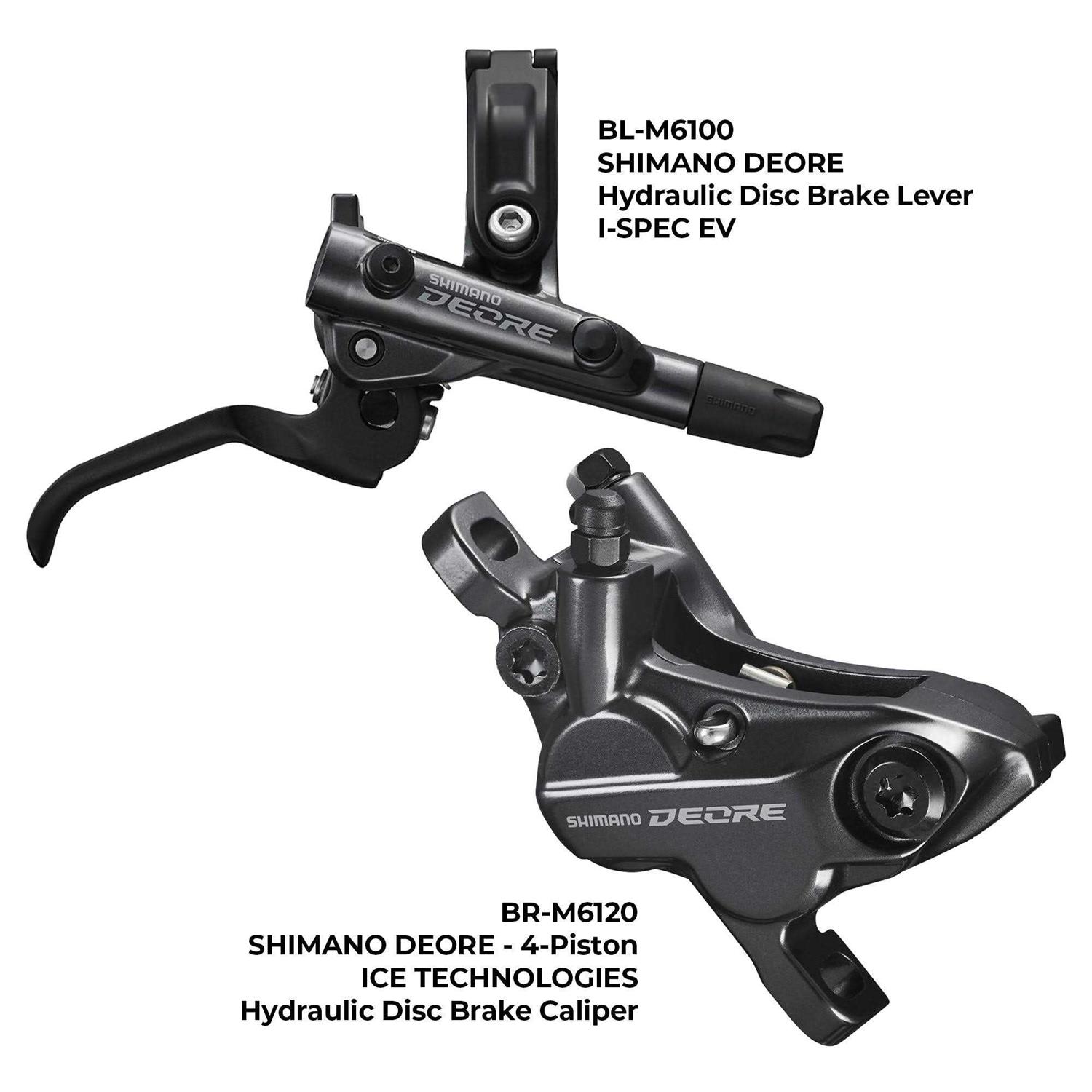 Making its way onto the new Shimano Deore 12-speed group is the updated Deore BR-M6120 Disc Brake caliper. At the heart of the new M6120 is the high powered four-piston system that offers high stopping power and quick retraction after letting off the levers for excellent modulation and a small and large piston engagement sequence. Smaller pistons engage with the incoming rotor, followed up with larger pistons to handle the larger stopping forces. This reduces rotor wobbling under load and also reduces noise and chatter to help you enjoy the ride instead of fretting over concerning bike noise. The M6120 keeps your lines and your garage cleaner as well with One Way Bleeding tech that, you got it, has one way bleeding to prevent air bubbles from being trapped in your lines, which improves braking feel and safety. Add a funnel tool for easy cleanup too. You’ll also be pleased to see that Shimano’s high-performance ICE Tech is onboard to keep temps under control during extended periods of braking.