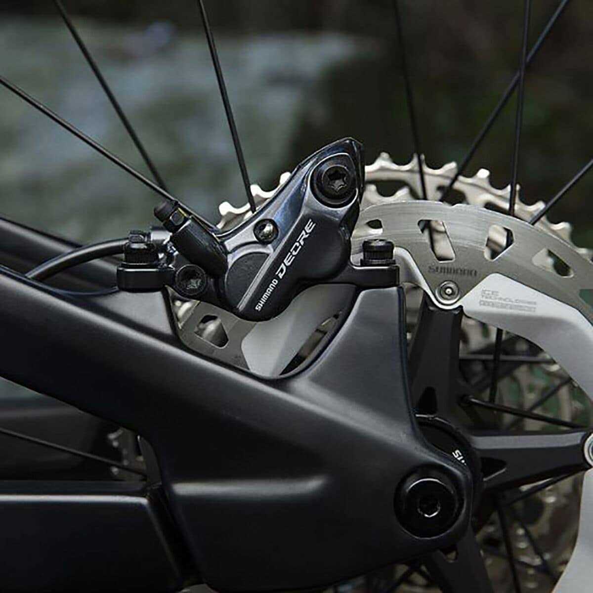 Making its way onto the new Shimano Deore 12-speed group is the updated Deore BR-M6120 Disc Brake caliper. At the heart of the new M6120 is the high powered four-piston system that offers high stopping power and quick retraction after letting off the levers for excellent modulation and a small and large piston engagement sequence. Smaller pistons engage with the incoming rotor, followed up with larger pistons to handle the larger stopping forces. This reduces rotor wobbling under load and also reduces noise and chatter to help you enjoy the ride instead of fretting over concerning bike noise.The M6120 keeps your lines and your garage cleaner as well with One Way Bleeding tech that, you got it, has one way bleeding to prevent air bubbles from being trapped in your lines, which improves braking feel and safety. Add a funnel tool for easy cleanup too. You’ll also be pleased to see that Shimano’s high-performance ICE Tech is onboard to keep temps under control during extended periods of braking.