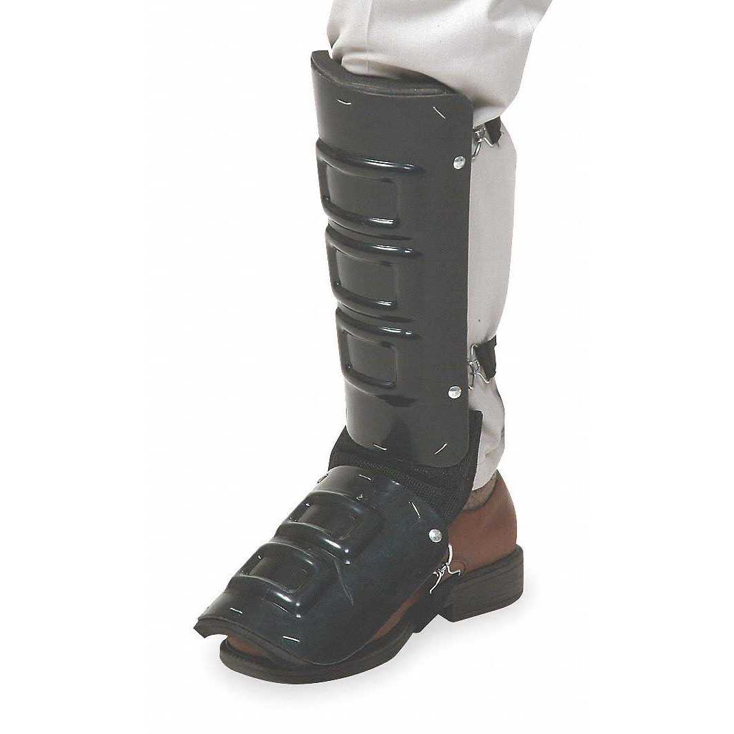 Leg guards (sometimes called shin guards) protect against injuries cause by walking into hazards. They protect the front of the leg below the knee and often incorporate metatarsal guards to protect the top of the foot and extend to cover part of the knee. They are attached using an adjustable strap and are intended for intermittent use.