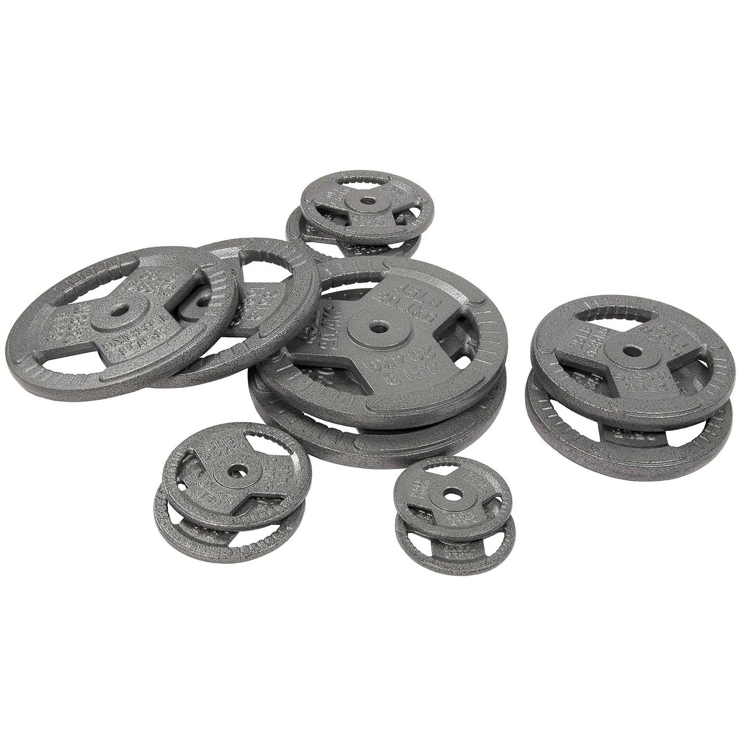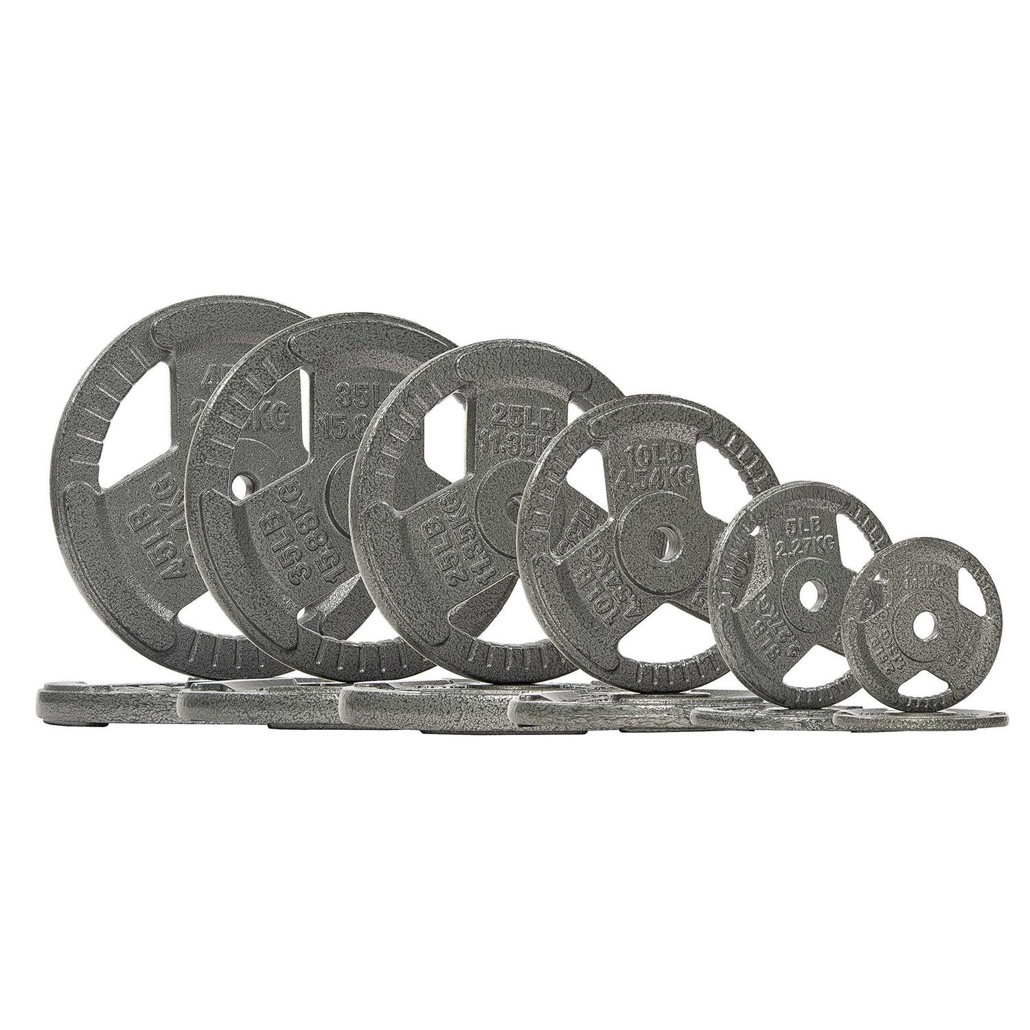 Made of solid cast iron with a 1-inch center hole fits any olympic bar with diameter 1” or less; can be used with 1” dumbbell bars too All plates features a durable, black baked enamel finish to prevent the plates from rust and corrosion without any unpleasant odor Each plate has 3 large openings with strips on them for easy grip. labeled in both lb and kg for easy recognition Weight plates can be used to perform muscle strengthening exercises and endurance training, or to increase flexibility and balance 2.5 pounds, 5 pounds, 10 pounds, 25 pounds, 35 pounds, 45 pounds