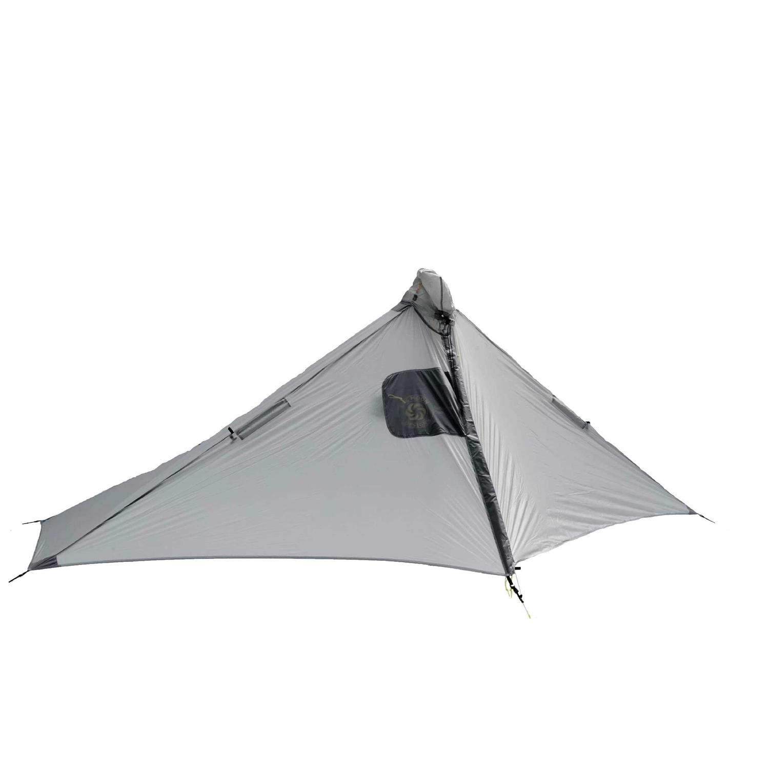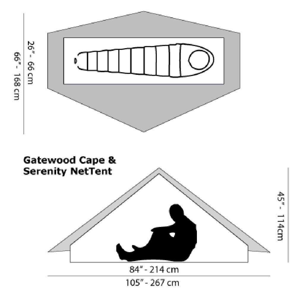 The Gatewood Cape’s unique 360 Degree Protection provides full coverage either when worn as a cape or used as a shelter. Unlike ponchos capes don’t have long slits along the sides. While the poncho may allow for more ventilation it does little to keep out wind blown rain. Dual zipper pulls on the front of the Gatewood Cape allow you to regulate ventilation while still providing full protection. Plus the open skirted design allows fresh air to enter the bottom. As a shelter the Gatewood Cape provides significantly enhanced protection when compared to your typical poncho/tarp. Its sturdy pyramid design easily sheds rain or snow and wind simply flows around it. Any sudden change in wind direction in the middle of the night won’t leave you scrambling to re-orient your shelter or force you deeper into your bivy. Unlike a tarp the Gatewood Cape is a shaped tarp and eliminates all exposed sides leaving you safe and secure. With 35 square feet of coverage under the shelter’s canopy you’ve got plenty of room for you and your gear. Depending upon conditions you can even adjust the vestibule to different heights to increase ventilation. A long zipper on the vestibule makes opening and closing the shelter a snap. For the adventuresome day hiker the Gatewood Cape makes the perfect addition to your 10 essentials survival kit. It packs down incredibly small and provides peace of mind knowing you’ve got excellent protection close at hand. For added bug protection the Gatewood Cape mates with Six Moon Design’s Serenity NetTent. Together they keep both the rain and bugs at bay. Providing you with secure and comfortable space. Requires one pole Either a trekking pole or Six Moon Designs 45 inch carbon fiber tent pole. Sold separately. This tarp is not seam sealed. To seam seal this tarp you will need a silicone based sealer.