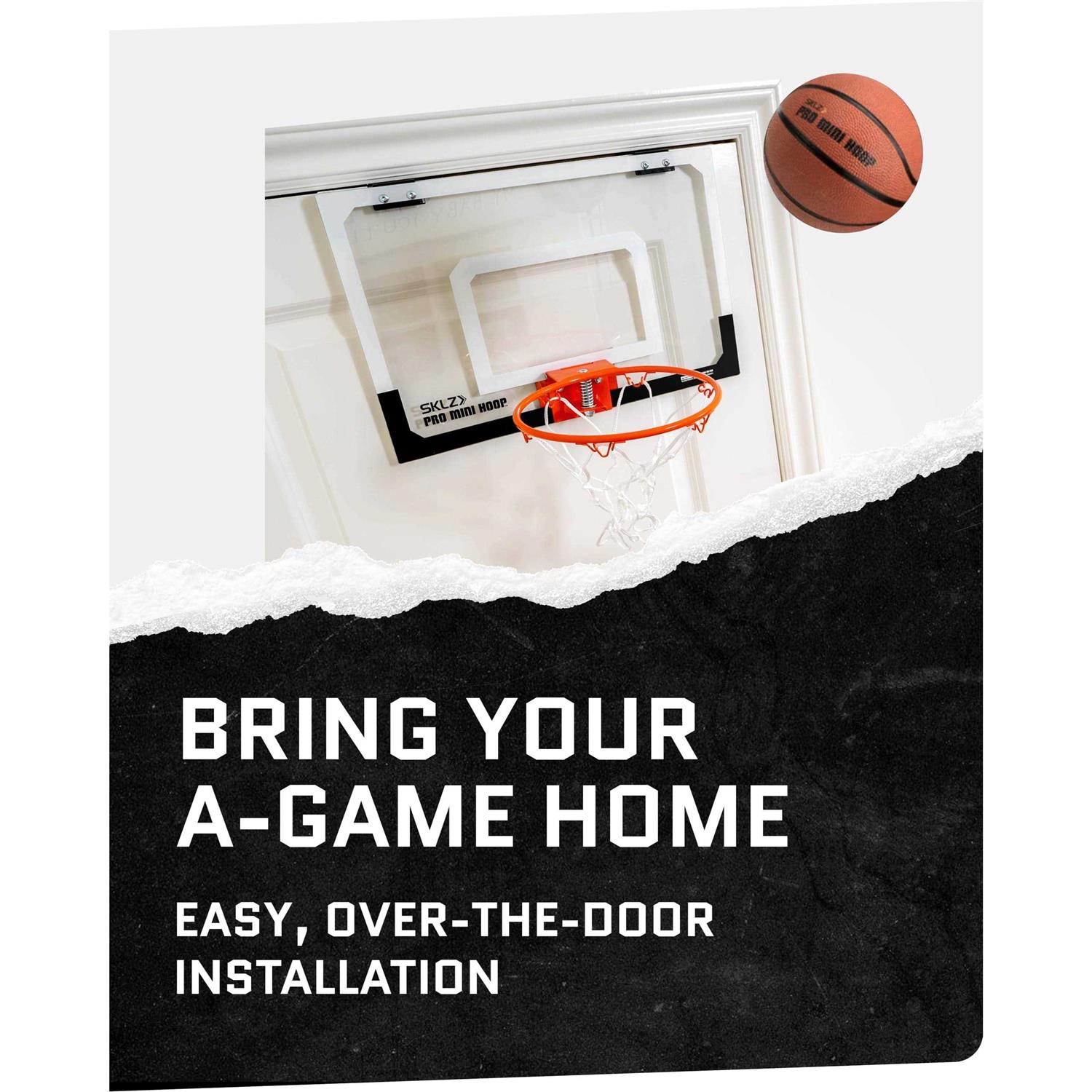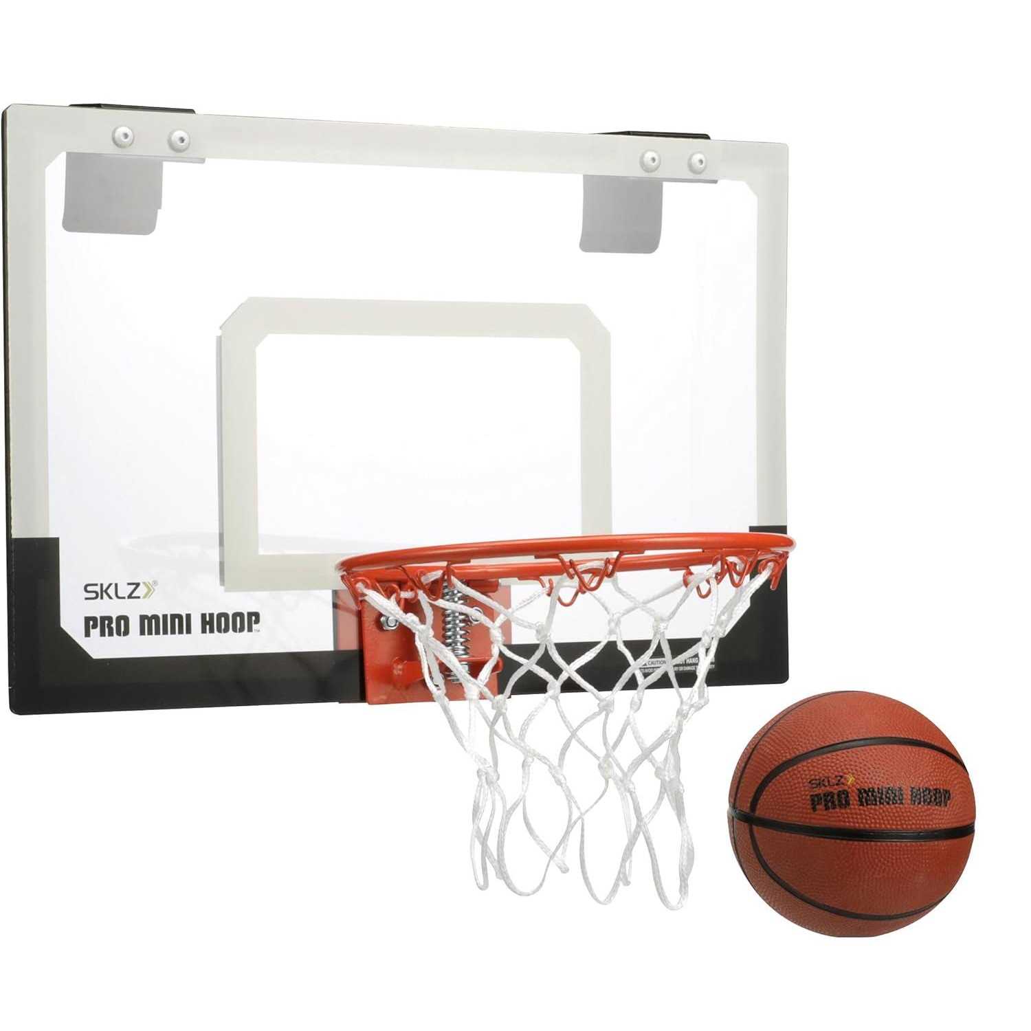 Product Description:The SKLZ Pro Mini Basketball Hoop is the perfect way to practise your 3 pointers or free throws without committing to a full game on the court. With a shatterproof backboard, and ultra durable, 8 loop net, it can handle the swoosh of powerful athletes, and the rough and tumble play of kids. Set it up in your bedroom, basement, playroom, or at the office. With pre-installed over the door hooks, you can guarantee easy set up for fun, no hassle shots. With foam installed behind the shatterproof polymer backboard and metal brackets to reduce noise pollution, you can shoot hoops anytime of the day or night without the worry of bothering your neighbours, parents, or coworkers. Keep kids active indoors, or take a few shots during the day between meetings or classes. The professional grade basketball hoop with a breakaway rim allows for slam dunks, layups, bank shots, and more. You can be sure that your fun will last, with easy and quick set up. The SKLZ Pro Mini Playground Basketball Hoop package includes a 18×12 polymer backboard with a brushed metal finish, pre-installed padded brackets that hook over your doorframe, a 5 Mini Pro rubber basketball, a 9 diameter spring action break-away steel rim, and a wrench. Set up and start shooting baskets in a matter of minutes.