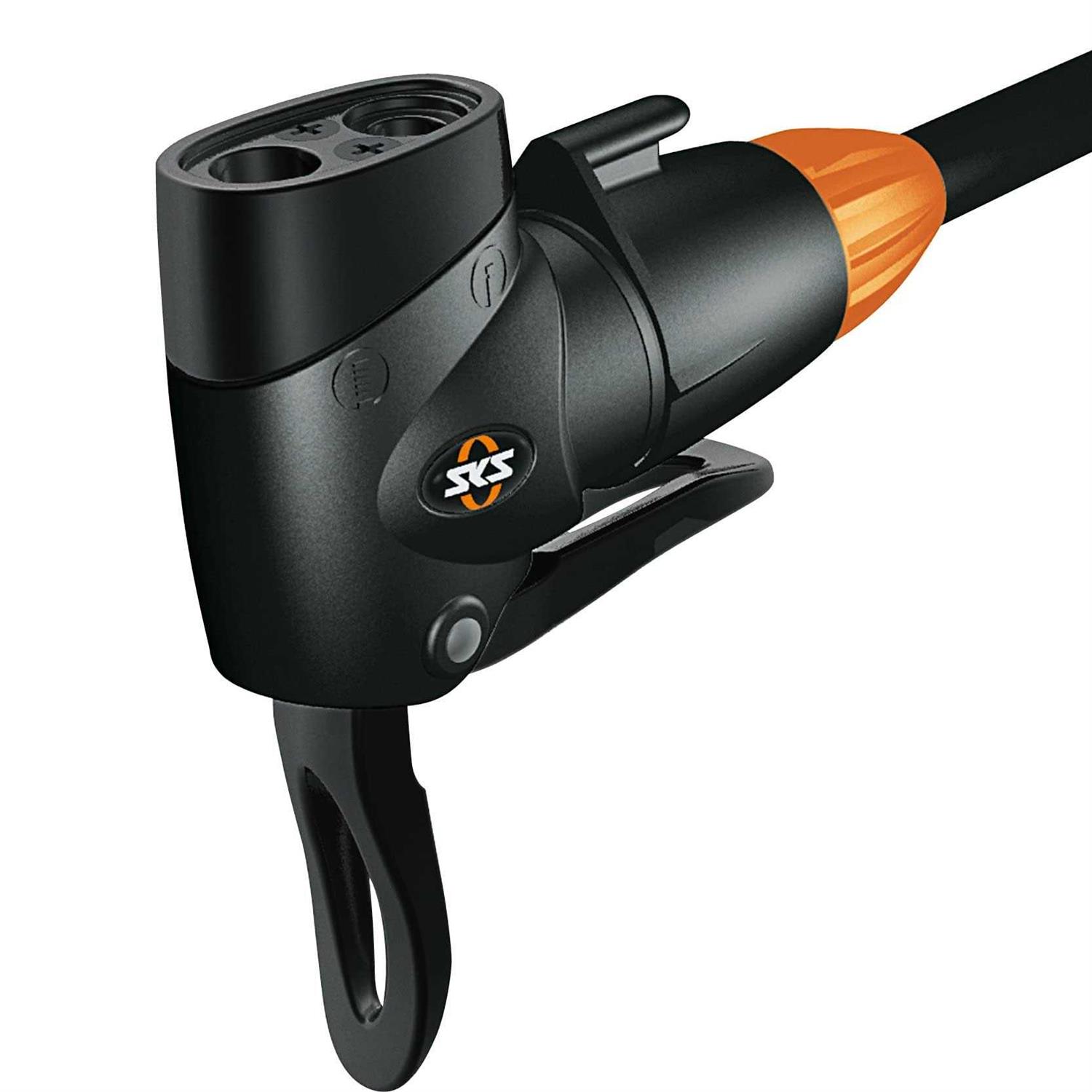 SKS Multi-Valve head retrofits to any SKS floor pump. Will also fit any pump with a hose diameter of 5.0-5.7mm. One hole for presta valves, one hole for schrader valves.