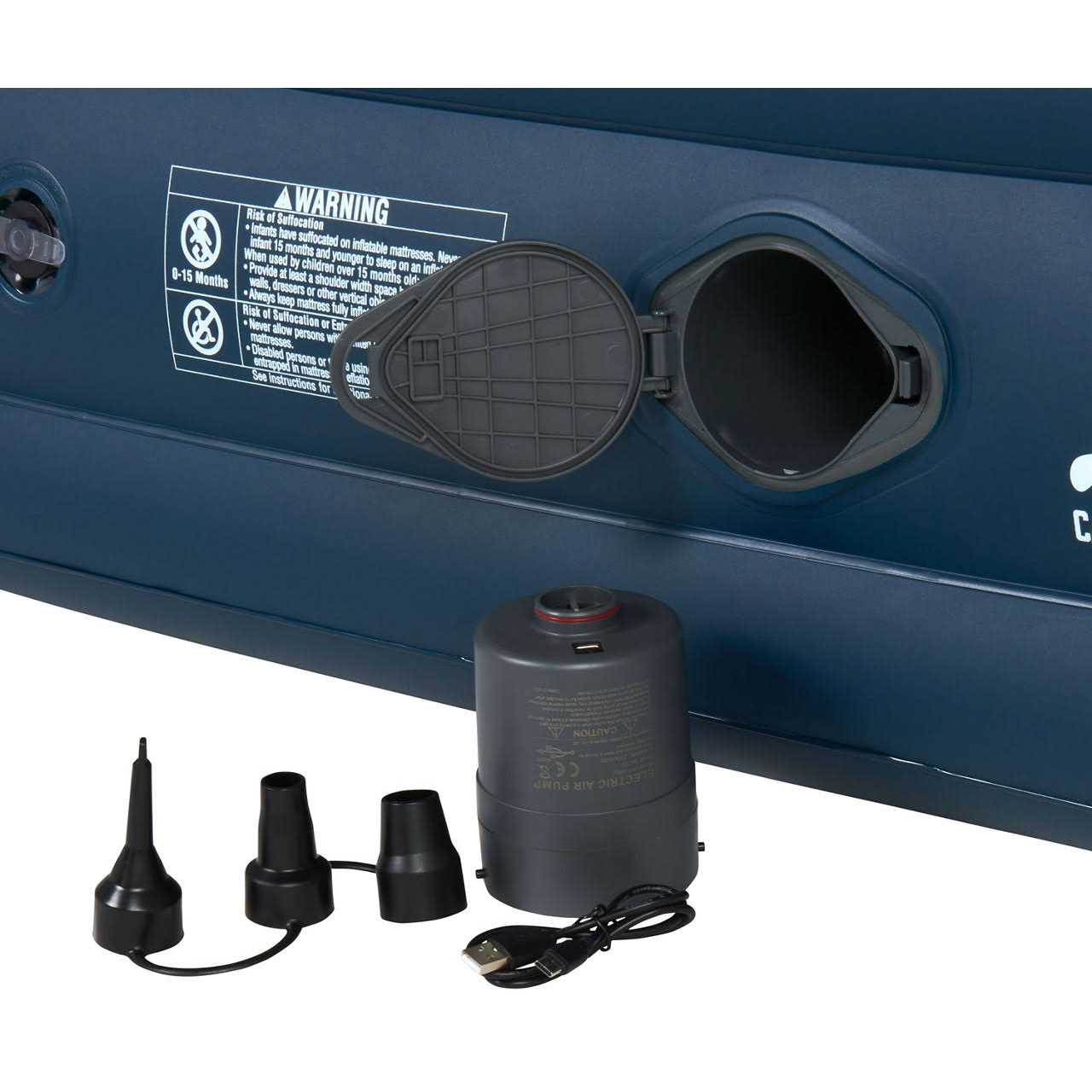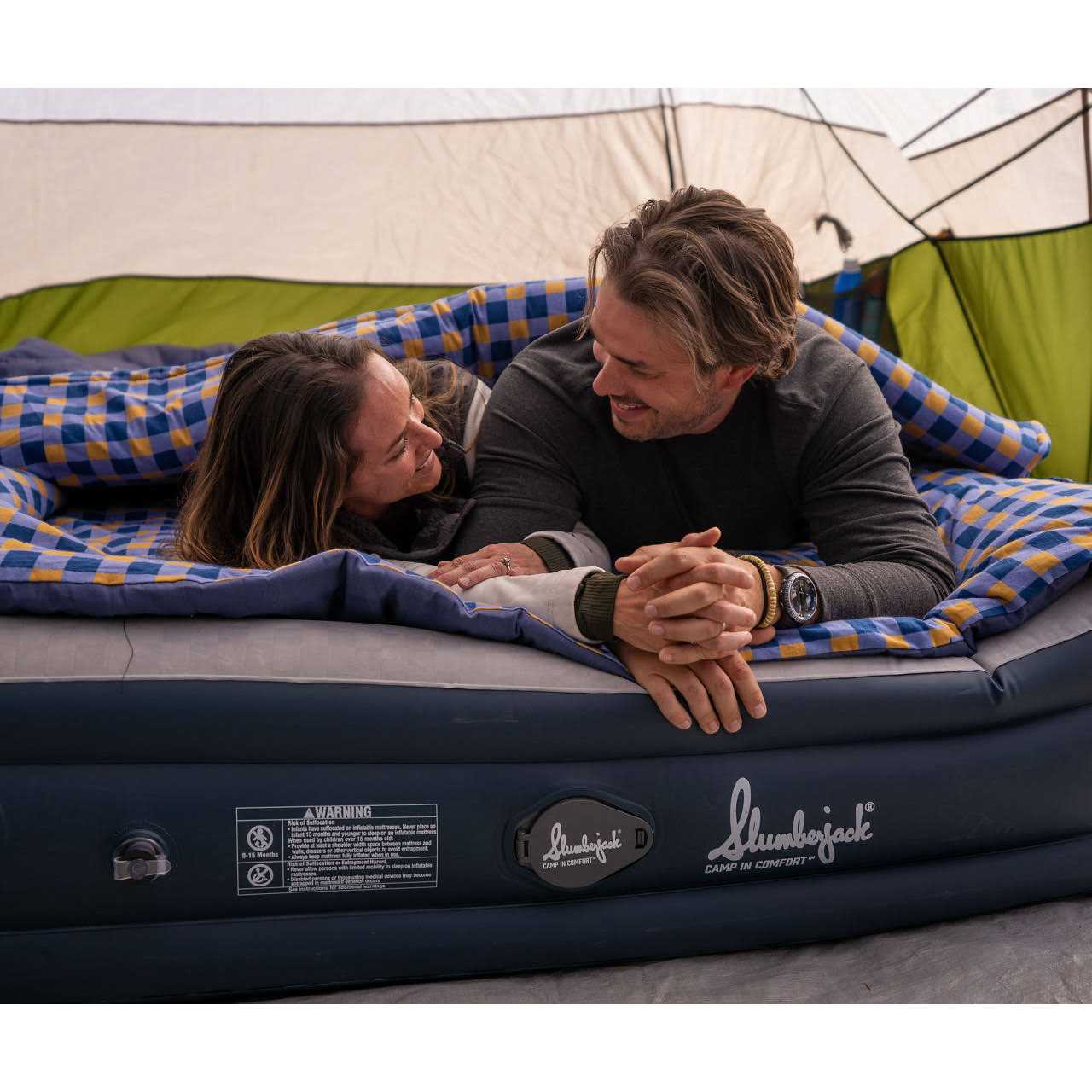 Just like all of our products, the Slumberjack Grand Mesa 15 inch Airbed Mattress, Queen was designed for maximum comfort and durability so you can camp in comfort. The unique checkered pattern has an ultra-plush topper that creates a soft and breathable night’s sleep no matter the temperature. The Slumber Coil Technology system uses 35 independent coils to allow for a firm yet supportive for the perfect night sleep. The elevated 15 inch height of the airbed is designed to make getting in and out easy and effortless. The pump sits inside of the airbed for a quick 3-minute inflation. The pump is also removable so you can charge other inflatable items on the go. The portable pump is made with a high-capacity lithium battery and comes with extra nozzles and a charging cable for convenience.