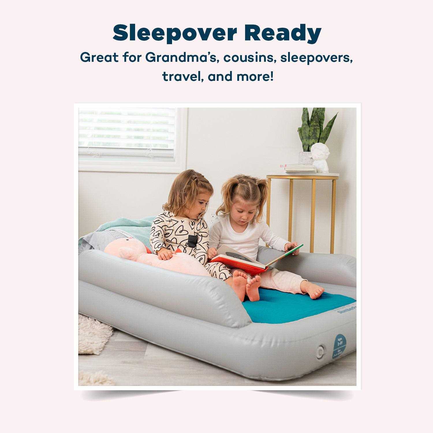 Drift off to dreamland with SlumberTot, the only inflatable toddler travel bed sized perfectly to work with the award-winning SlumberPod. Great for grandmas, cousin sleepovers, vacation and more. SlumberTots cloud of comfort pairs a soft-touch sleep surface with integrated side rails for air-filled support and peace of mind wherever you may roam. Use on its own or with SlumberPod (sold separately).
