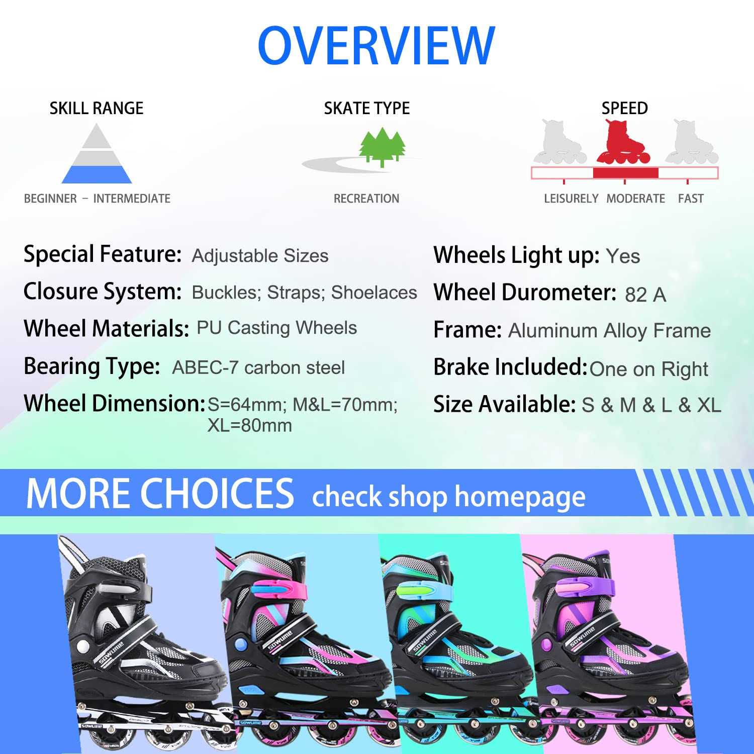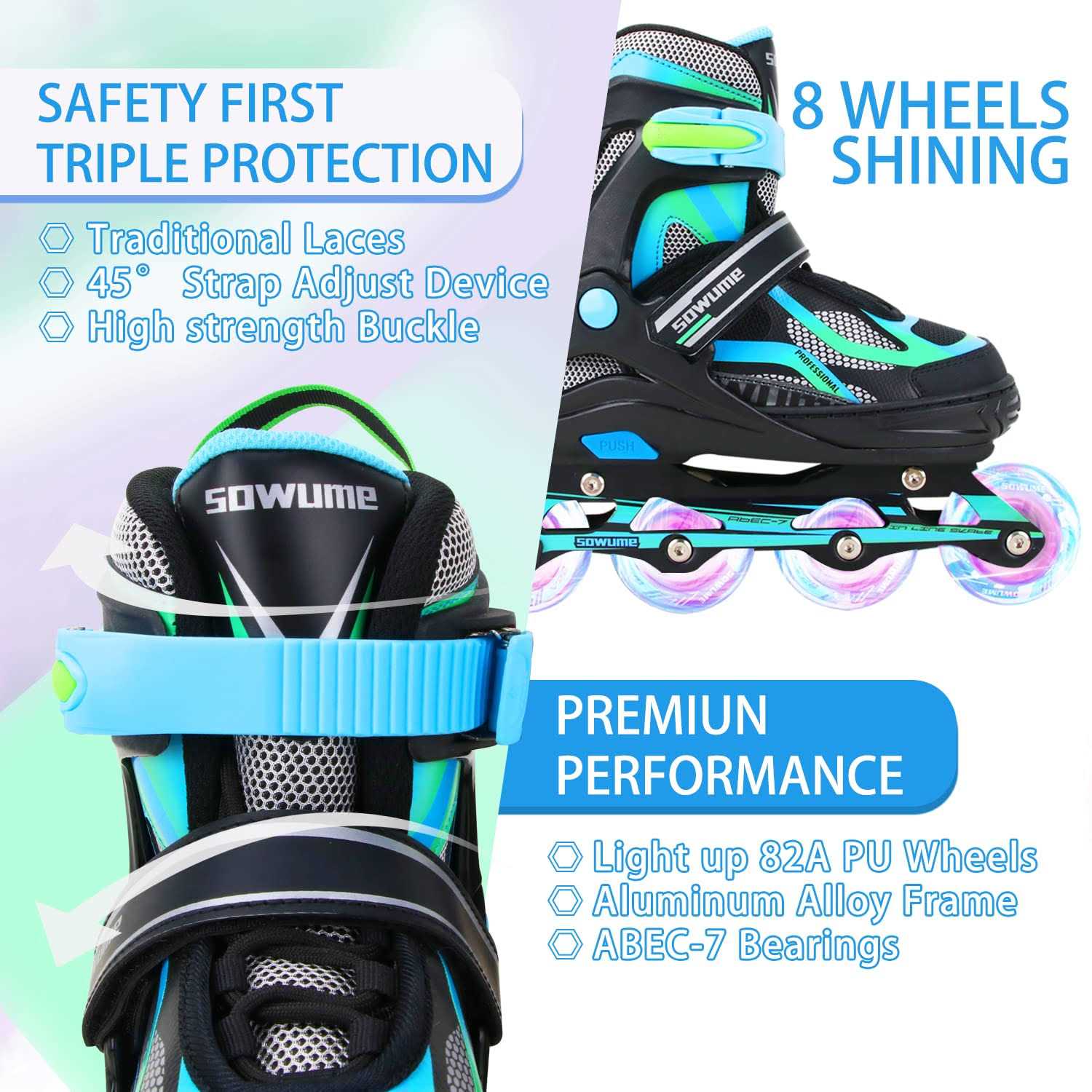 Sowume Inline Skates Highlights: Adjustable size – A humanized design can accompany kids that feet are still growing for a long time Illuminating wheels – Very attractive and cool features, they are designed as self-generated power system, NO BATTERIES NEEDED Unique pattern design – In line with the aesthetic of young people, keep up with the trend of fashion Multi colors and sizes