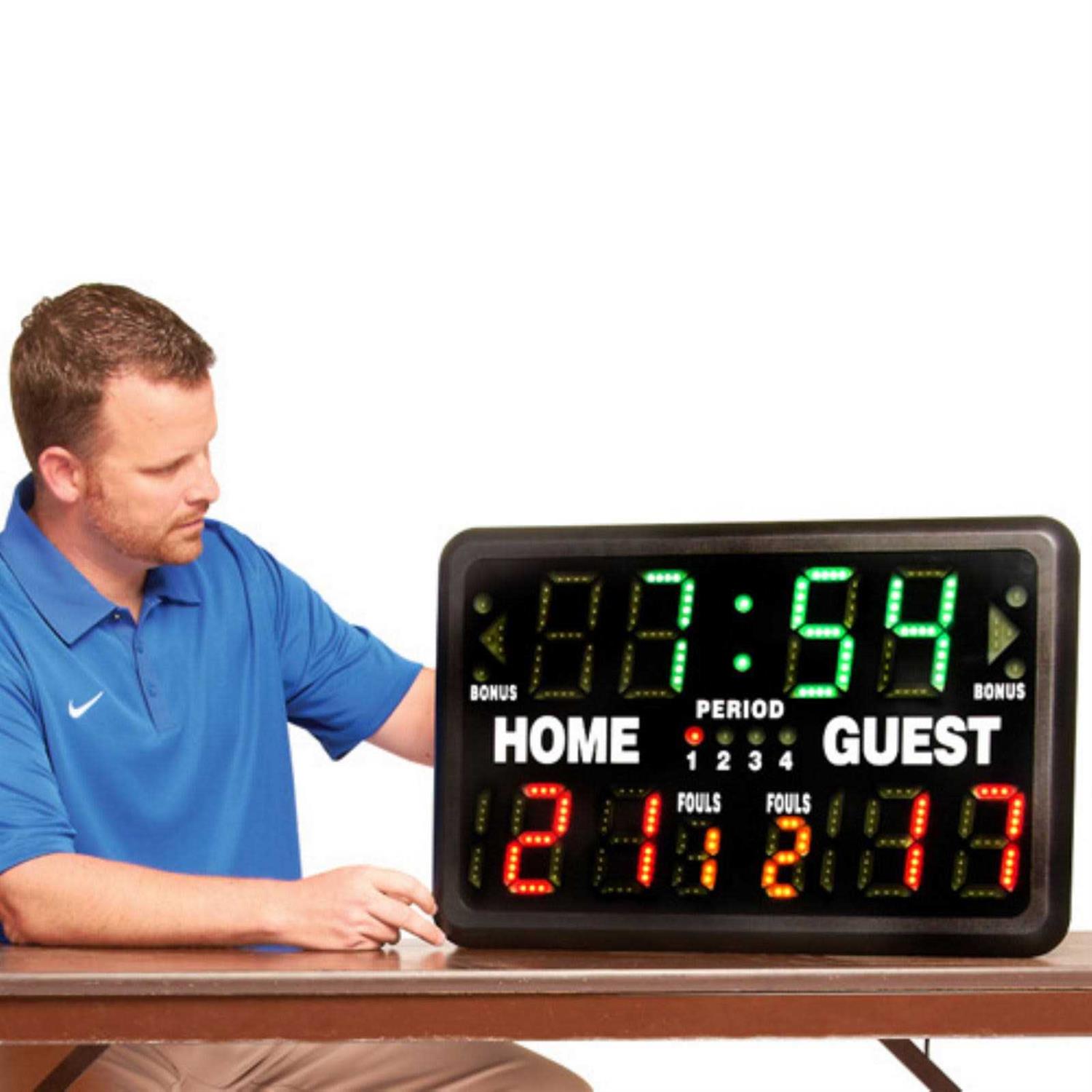 Keep track of the scores easily while playing games with family and friends using the MacGregor Multisport Indoor Scoreboard with Remote. It features a wireless remote with a 100-foot range that allows operators to conveniently adjust scores and set the clock. This portable electronic scoreboard is ideal for games like basketball, wrestling, volleyball, boxing, and more. The tabletop scoreboard can count up or down from 99 99 and can record scores up to 199. Further, its period, bonus, team fouls and possession indicators serve to keep accurate track of the vital game statistics. This MacGregor Multisport Indoor Scoreboard with Remote can also be used as a metronome, stopwatch, clock with alarm, and program timer. Its LED lit clock digits measure 4.75-inches while the LED lit score digits measure 4.25-inches.