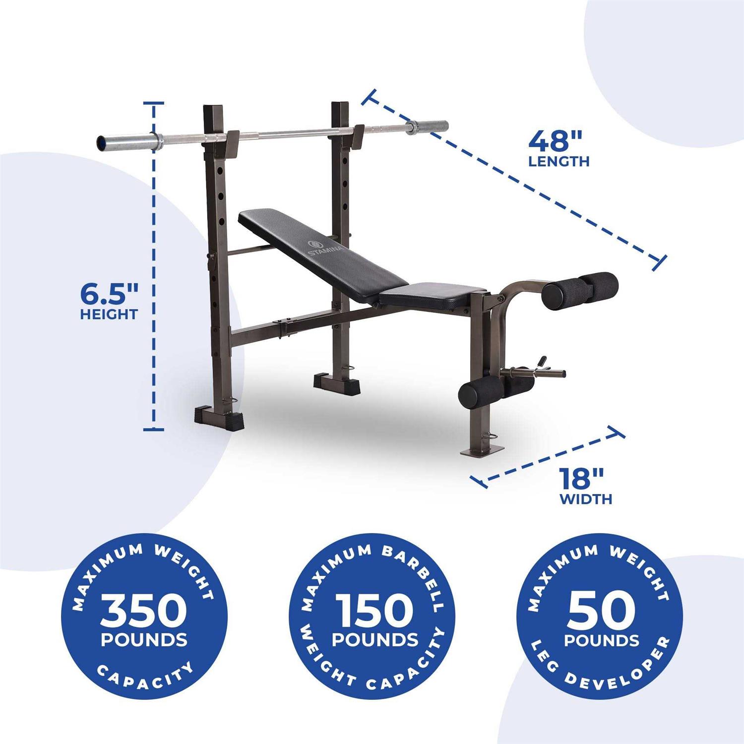 Elevate your home gym experience and achieve the results to meet your fitness goals with the Stamina Steel Weight Bench and Barbell Rack Combo. This dynamic workout set is now equipped with sturdy anchor points to seamlessly incorporate resistance bands into your training session. Combining a standard weights bench with an adjustable barbell rack, this exercise equipment is the simple solution for your strength training needs. From the sturdy bench to the incorporated Leg Developer, this durable gym equipment is just what youre looking for to take your fitness routine to new heights. This adjustable barbell set is built to last and is suitable for users of varying fitness levels. Featuring a sturdy steel frame, long-lasting durability is guaranteed throughout even the most challenging workouts, while the bench provides multiple incline positions and 3 height levels to target various muscle groups. The barbell rack is also adjustable, offering 4 height levels for a secure and convenient platform at any severity of barbell exercises. It also includes dedicated anchor points for resistance bands, expanding your exercise possibilities. The compact design of this barbell bench ensures you make the most of the space in your home gym without compromising on functionality. With no need for a complicated setup, the exercise combo set comes with easy-to-follow instructions to save time with assembly and get you going with your workout in no time. Transform your home gym into a powerhouse of strength and versatility with the Steel Weight Bench and Barbell Rack Combo from Stamina. Please note that the rack is specifically designed to accommodate only a standard 5-foot barbell, ensuring performance and security while you train.