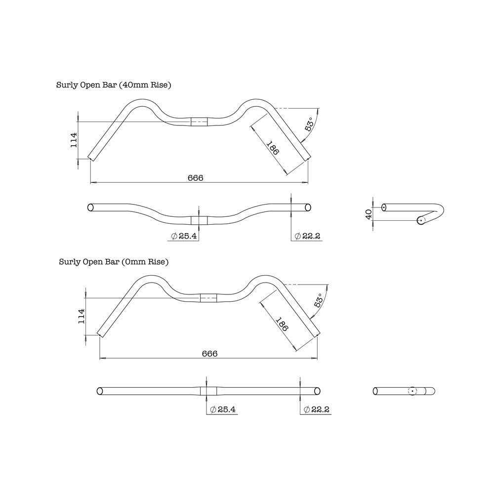 The Open bar is an upright bar but not an uptight bar. It’s equally suited to cruising, commuting, and singletrack. Categories are for suckers. The angle makes it comfy for wrists. The width enables loads of control. It’s got plenty of room for grips, shifters and brake levers. Knurled clamp area. 4130 CroMoly steel. Available in low rise and no rise versions. 22.2mm diameter grip area; good to go for MTB shifters, brake levers, and grips.