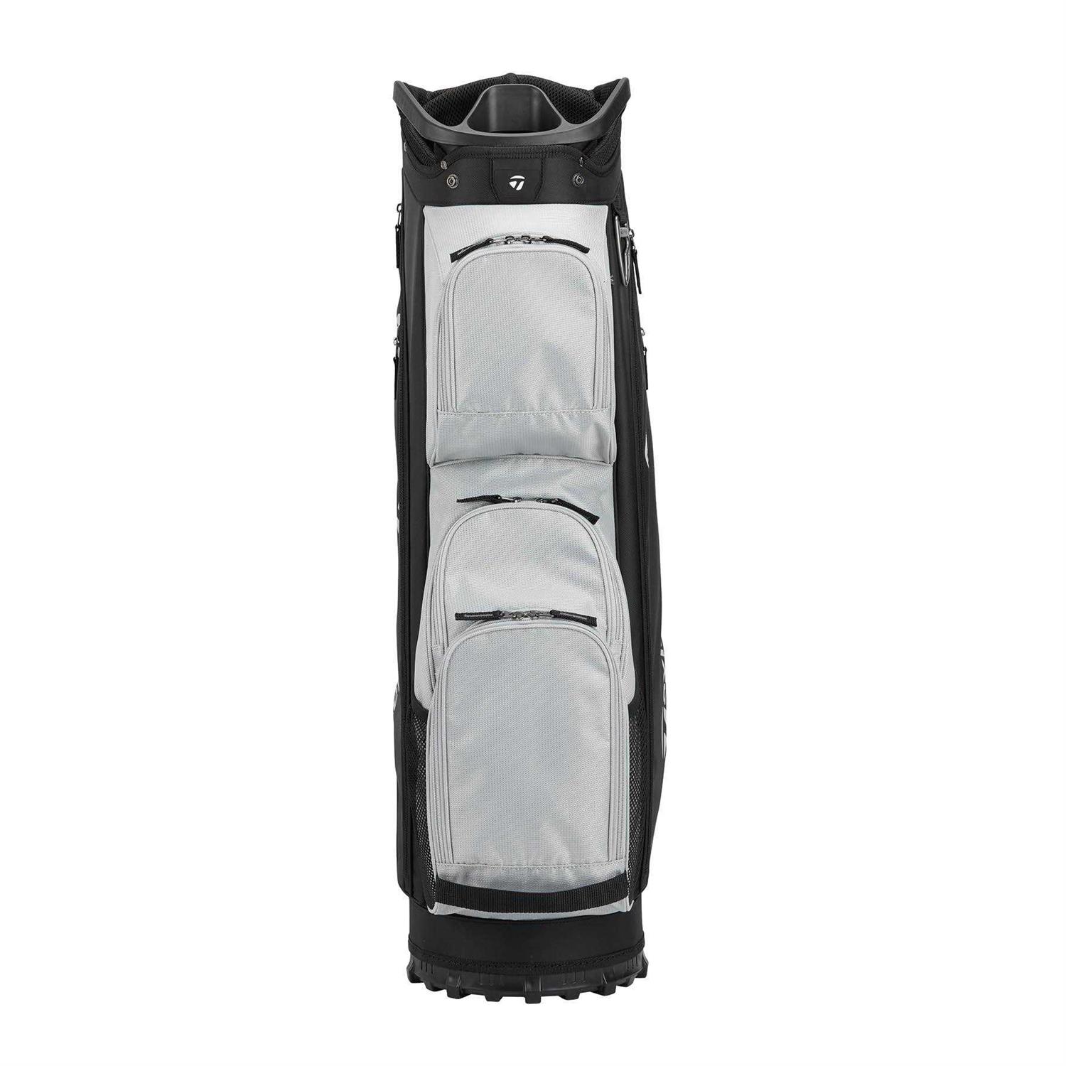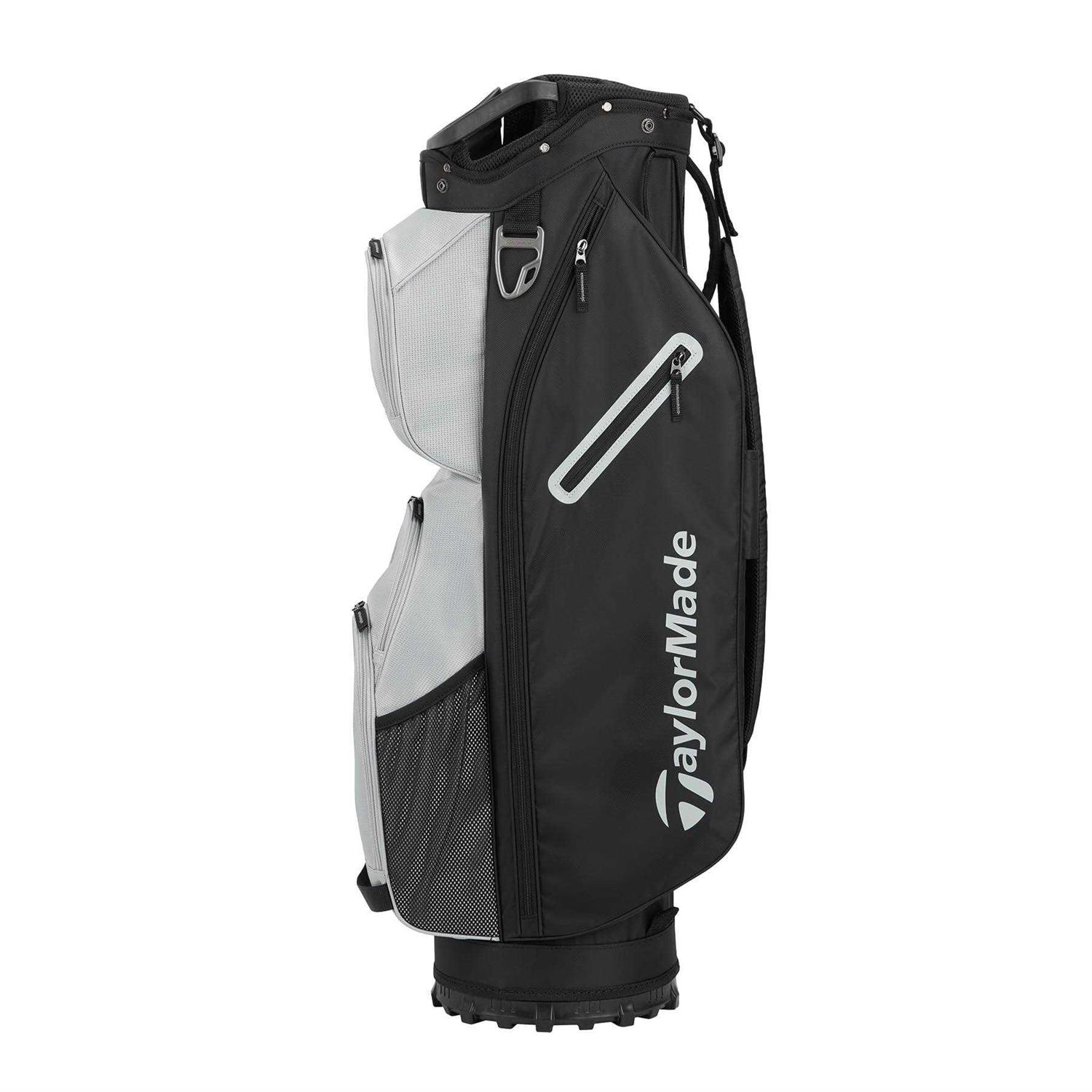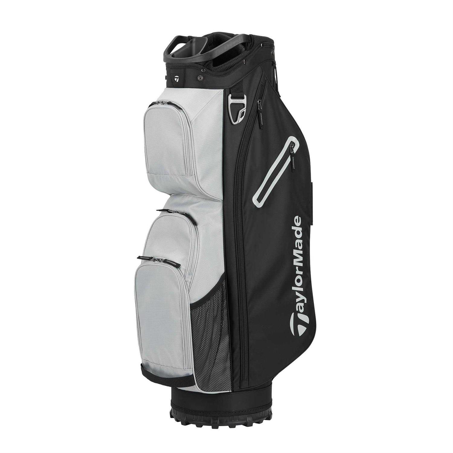 Cart Bags by TaylorMade. Details:The TaylorMade Classic Cart golf bag has 15 individual full bag length club dividers, additional front-facing pockets for easier access and more storage, a new fade-resistent yarn dyed fabric that holds color longer with UV-protected materials, a built-in putter protecting polymer patch, a magnetic stash pocket, an oversized cooler pocket, and a split-side apparel pocket for more separation