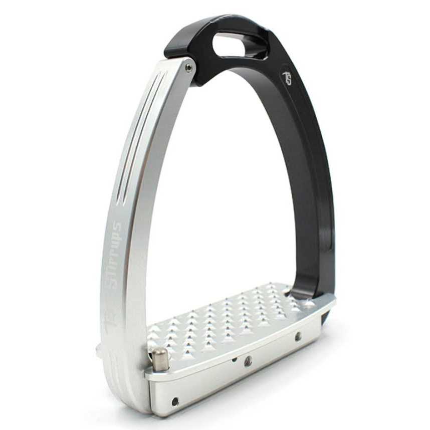 The Tech Venice Sloped EVO Stirrup Iron has a magnetic mechanism positioned on the tread that allows the opening of the branch for easy removal of the foot, after which the stirrup branch automatically returns to the original position. As a measure of safety, the branch will only open if a certain load weight is exceeded.The aggressive tread design allows for perfect grip and is angled 3 to support the ideal heels-down position. Additionally, the concave tread enhances contact. Pair. Made in Italy.