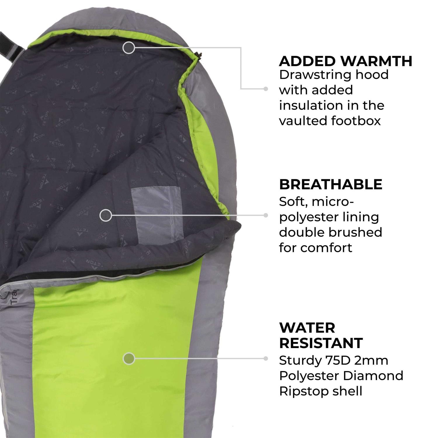 Thoughtfully designed with your comfort in mind, the TrailHead Lightweight Mummy Sleeping Bag, by TETON Sports, is filled with innovative insulation to keep you warm, but it can be compressed down to maintain pack space. The hood is designed to pull in tightly around your face for added warmth. The lining is soft to the touch and the foot box is designed with plenty of room for your feet. But dont just take our word for itread the reviews! The TrailHead is helping keep backpackers and campers warm and comfortable in The Great Outdoors.