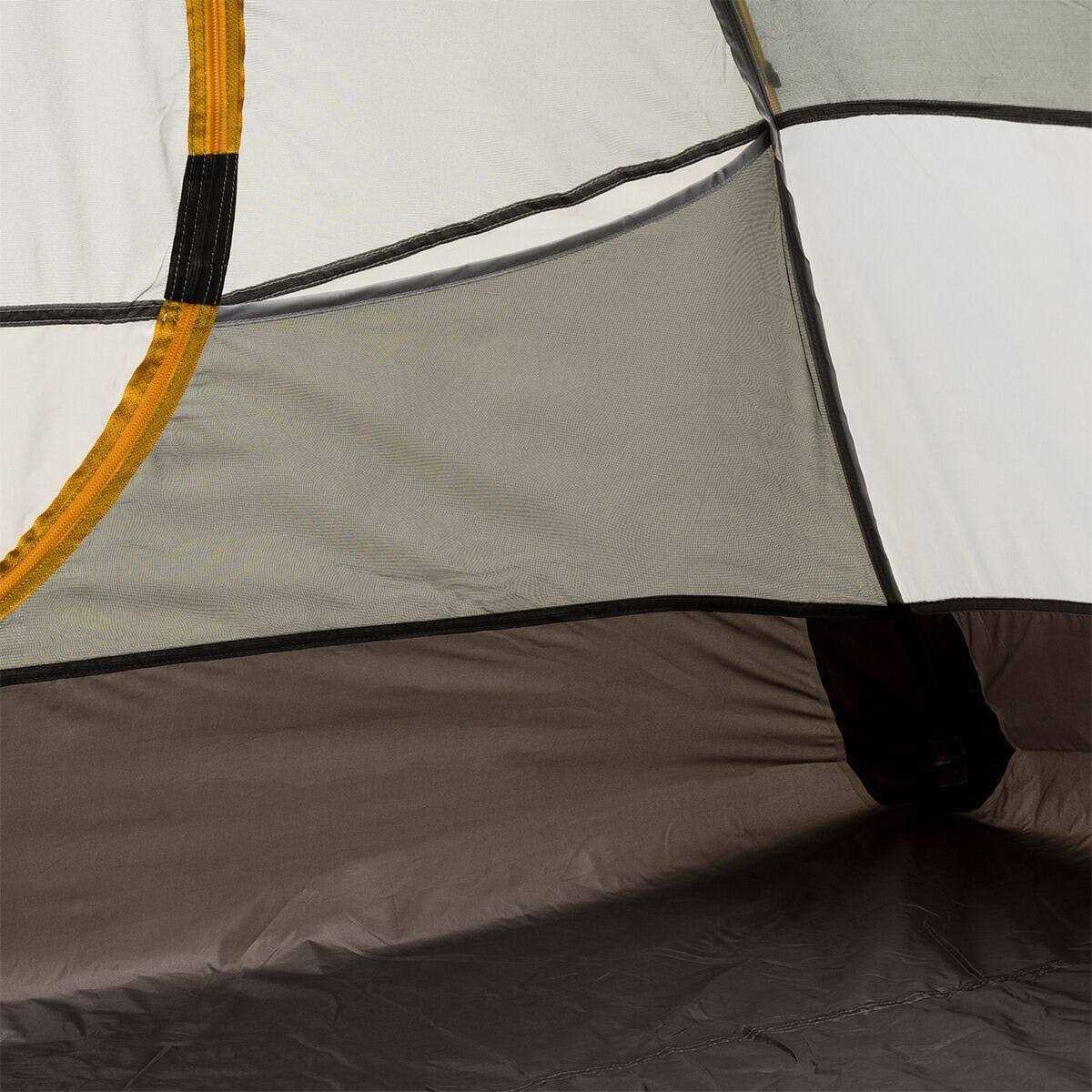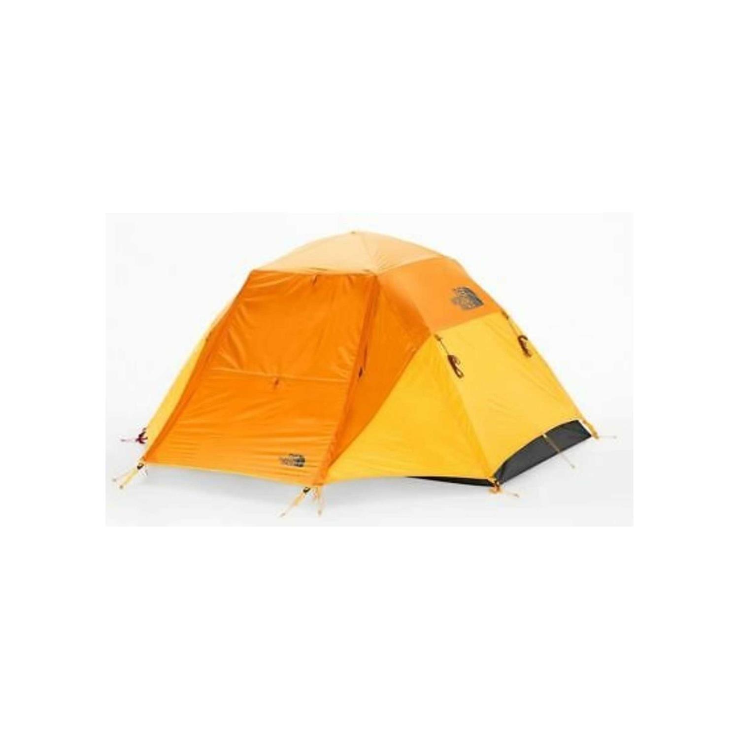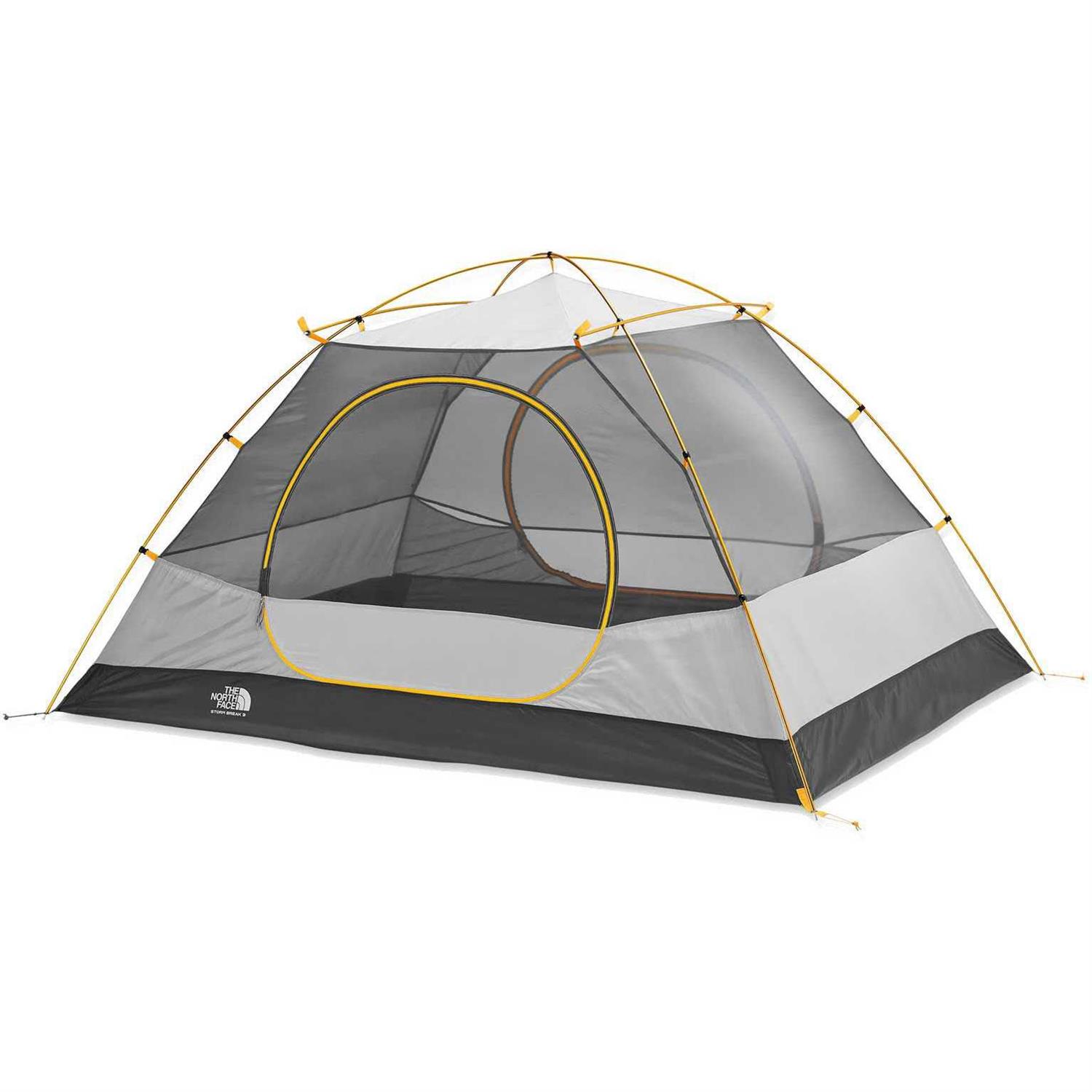 The classic best-selling The North Face Stormbreak 3 tent offers time-tested 3-season reliability and does so at a budget-friendly price. You get 2 doors 2 vestibules plenty of elbow room and peace of mind. Built to comfortably house up to three the tent has a 39.72 square foot interior. Vestibules in front of the two large side doors offer an additional combined 21.6 square feet of sheltered external storage space. Dual zippers let you pitch the fly awning style with trekking poles poles not included. Freestanding structure is provided by lightweight aluminum poles but stakes are included to ensure a taut secure pitch. The body of the tent is constructed of breathable 40D polyester mesh and durable 75D polyester taffeta. A unique configuration near the ceiling of the tent creates extra headroom and increases ventilation up high. The 75D polyester rainfly and 68D polyester floor have PU-coatings to ensure weather protection and all of tents seams are tape-sealed. The custom-fit Stormbreak 3 Footprint sold separately can be to add durability by protecting the floor of the tent from mud ground water and sharp objects like rocks exposed roots and pine needles.