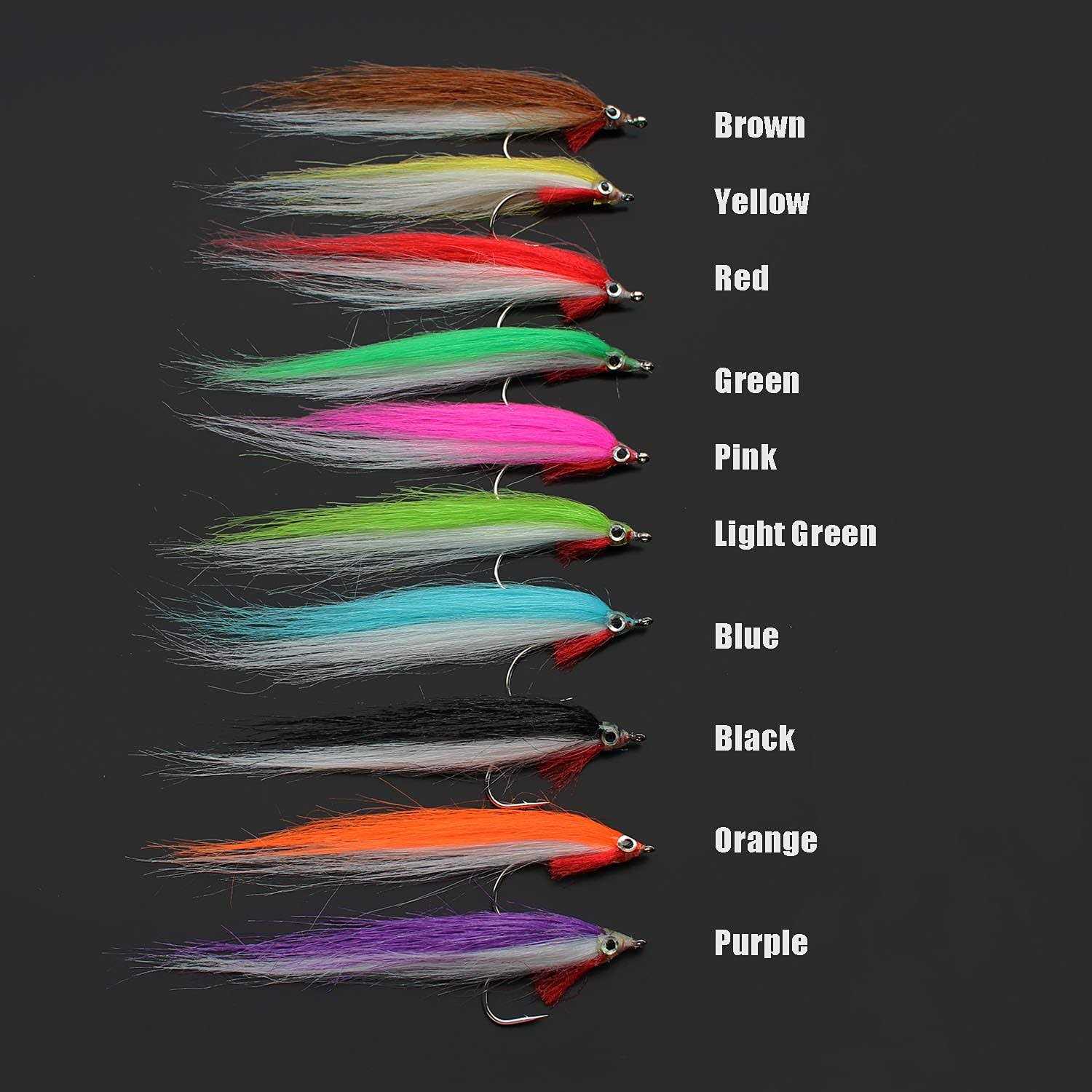 Color: brown, green, light green, orange, purple, yellow, red, blue, black, hot pink Hook size: 1/0 Length: about 11-12cm Quantity: 20 pieces (10 colors, 2 pieces each color) Application: fly fishing, salmon fishing, trout, etc. Weight: about 1g/pc Emballage : 20 pièces.