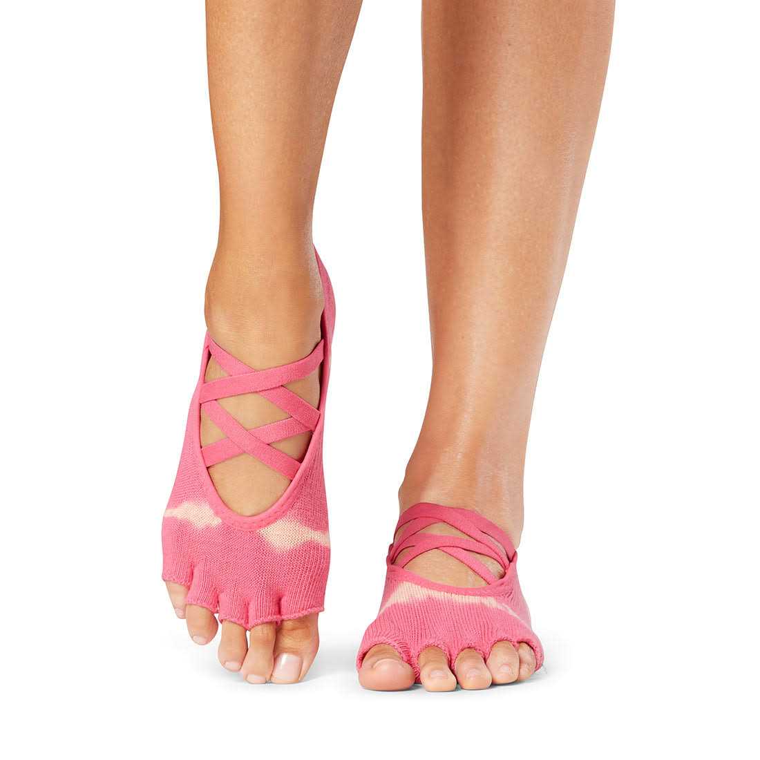 ToeSox Elle half-toe socks ideal for barefoot activities like barre, Pilates, yoga, and dance. Patented non-slip grip sole for secure foot placement. Arch band provides gentle pressure to lift and support. Fitted heel eliminates bunching and twisting. Open foot strappy top for style and breathability. Low-rise design fits below ankle. Hygienic alternative to bare feet. Cotton/polyester/spandex/elastodiene. Machine wash. Imported.