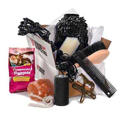 The Tractor Supply Horse Treat and Accessory Gift Box is the perfect gift for horse lovers. This horse treat set contains horse treats, a coat brush, a mane and tail comb, a bath mitt, cleaning sponge, rock salt and more. Constructed with cardboard material, this horse accessory set also comes with a poly hay net for feeding hay in the trailer, show or stall and 1.1 lb. of Himalayan rock salt. 1 lb. bag of peppermint nuggets horse treats Medium bristle brush for fur and coat Horse treat set comes with a mane and tail comb Chenille wash/applicator mitt Poly hay net for feeding hay in the trailer, show or stall 1 roll of ToughFlex multi-purpose bandage Horse accessory set includes 1.1 lb. of Himalayan rock salt Hat and suede cleaning sponge keeps your suede hats and chaps free of dust and fuzz Decorative standing horse single hook for the barn, office, house or trailer Constructed with cardboard material; cardboard lid