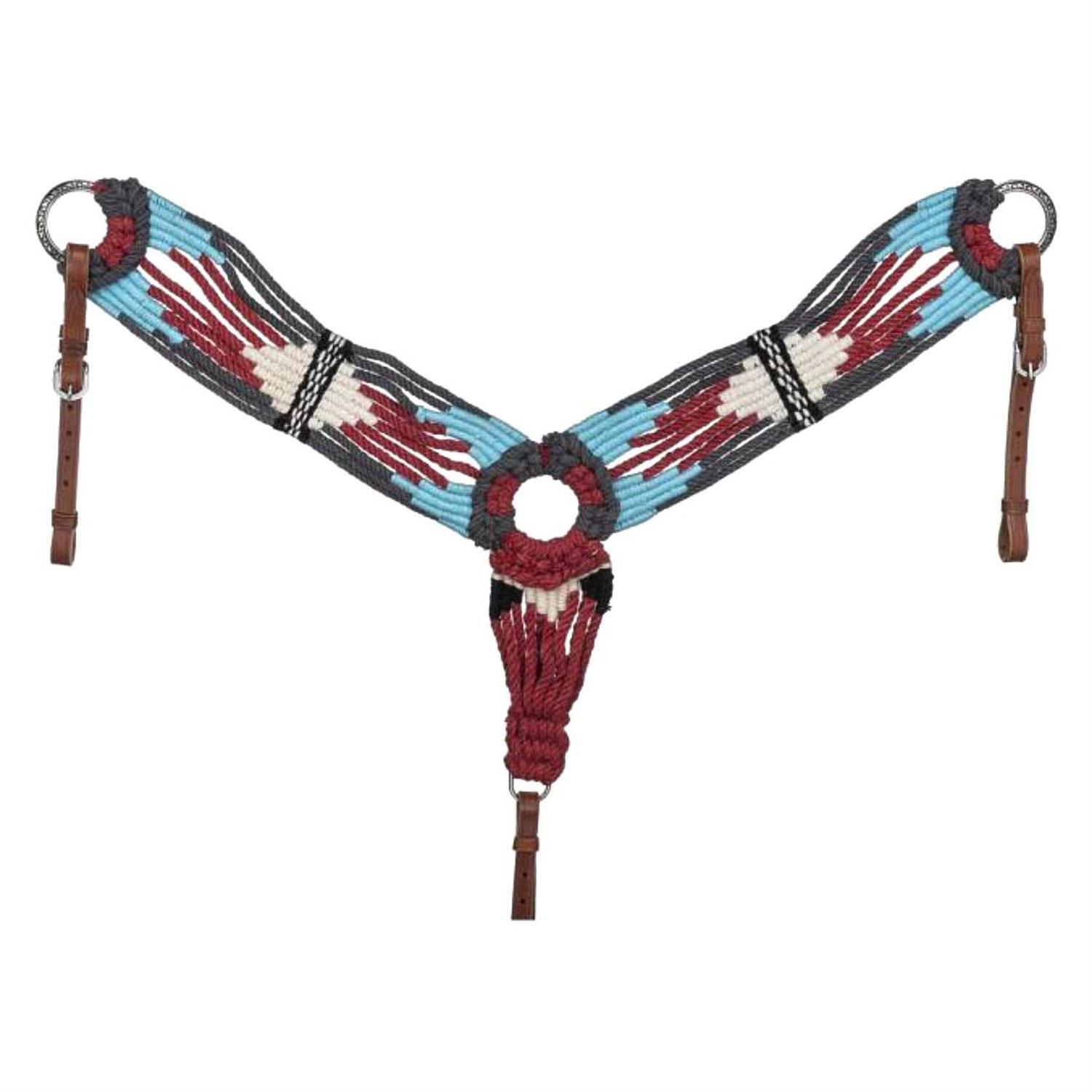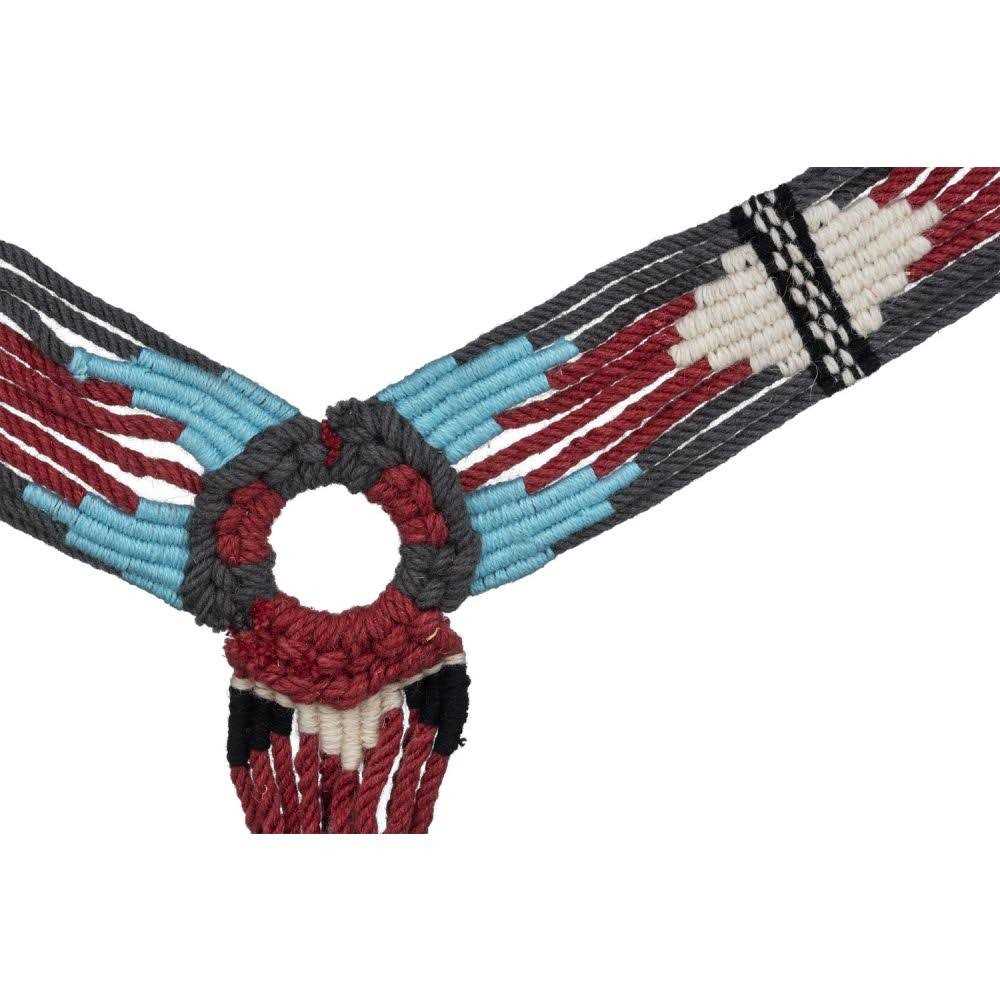 Get the look of mohair without the expensive price tag! This wool string breastcollar is perfect for the ranch horse enthusiast. Hand twisted wool string construction in bold and unique color combinations and patterns. Complete with adjustable leather tug straps and a girth snap for easy on/off.