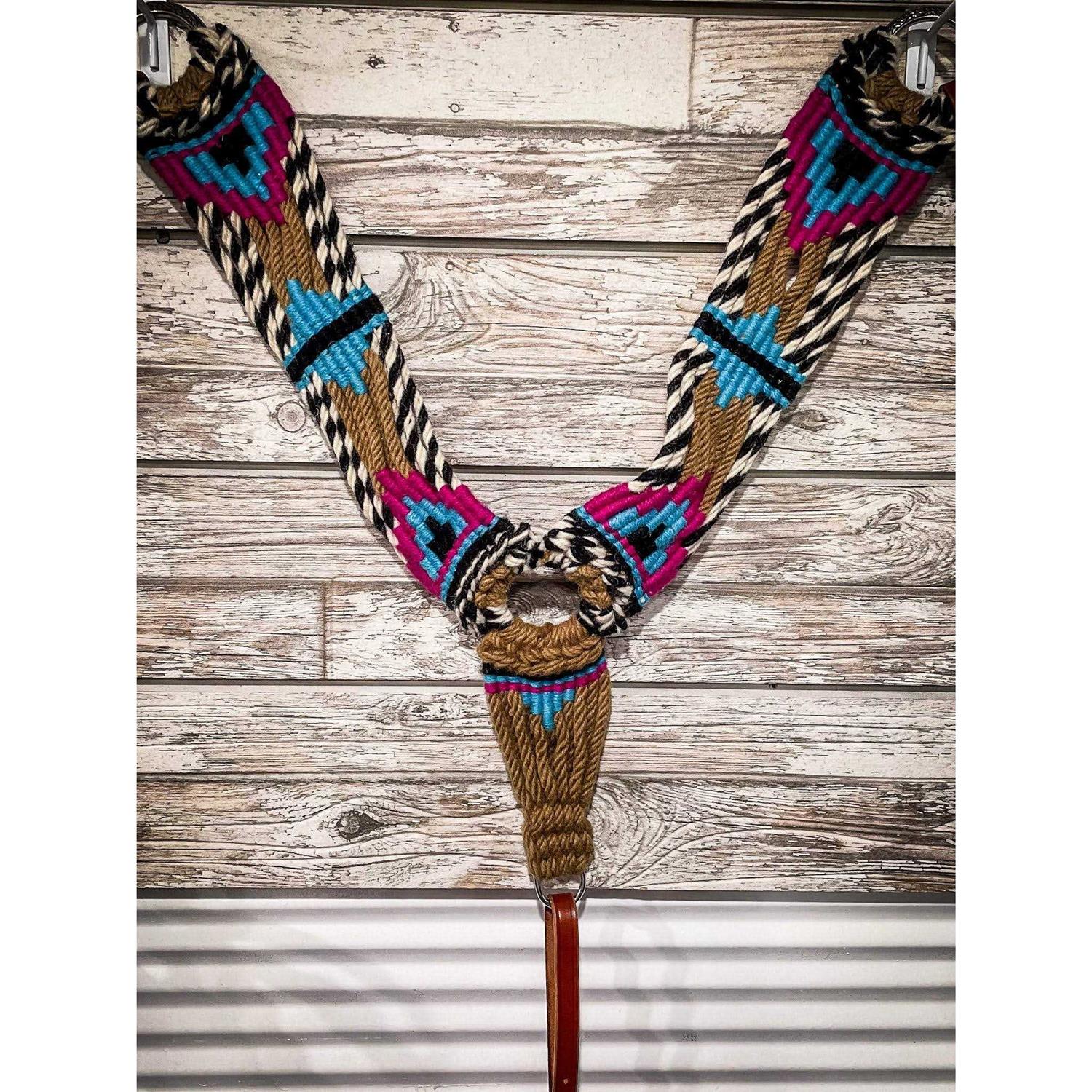 Get the look of mohair without the expensive price tag! This wool string breastcollar is perfect for the ranch horse enthusiast. Hand twisted wool string construction in bold and unique color combinations and patterns. Complete with adjustable leather tug straps and a girth snap for easy on/off.