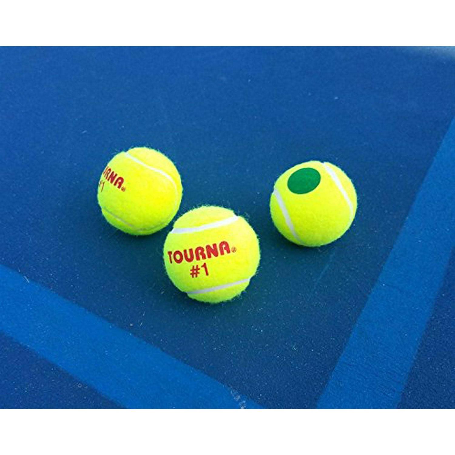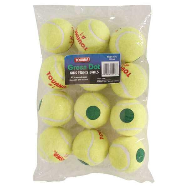 Tourna green dot tennis balls have 25% reduced pressure and bounce lower than a standard tennis ball. The balls are pressurized but at a lower pressure than a standard tennis ball. This results in the ball bouncing lower slower and making it easier to hit. Great for full-sized courts. Made to USTA and ITF tournament specs.