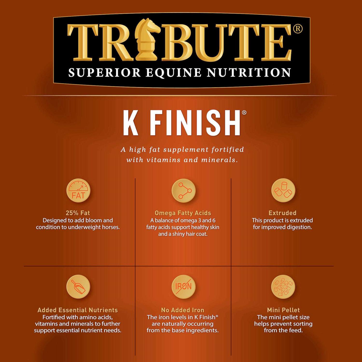 If you need to add fat to your horse’s diet, start feeding him Tribute K Finish High Fat Horse Supplement—specially formulated with a blend of full-fat soybeans, flaxseed and rice bran to provide a 25% high-fat fortified supplement. Suitable for all classes of horses, this pelleted supplement is especially beneficial for hard-keepers and horses requiring less sugar and starch in their diet. These hearty horse pellets are fortified with vitamins, antioxidants, organic minerals, essential amino acids and fatty acids, to help your horse flourish.