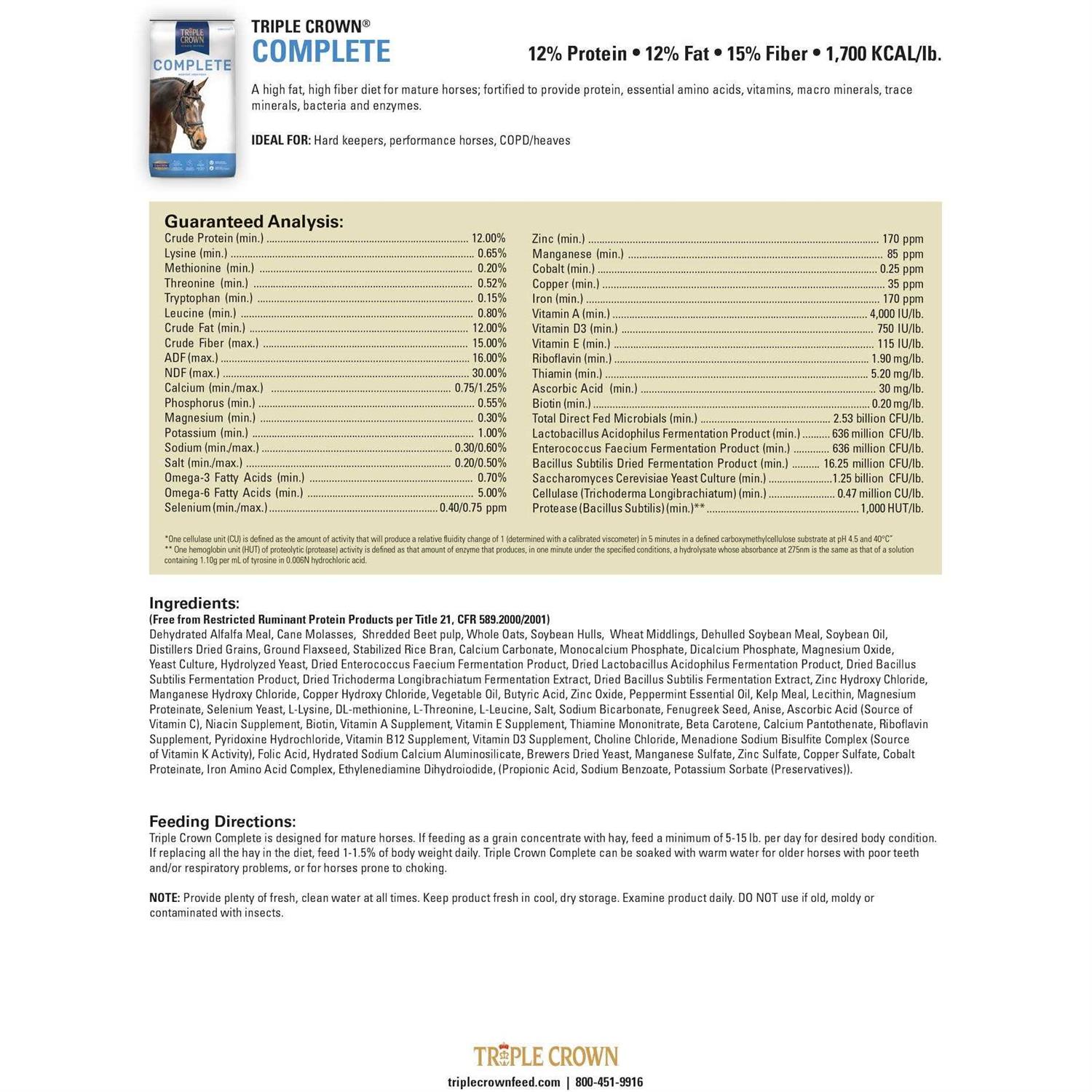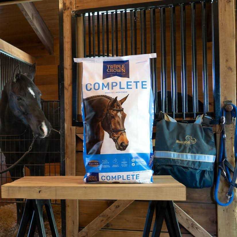 A high fiber, beet pulp-based feed. Ideal for hard keepers, performance horses and horses with COPD/heaves or gastric ulcers. May also be used as a complete diet. A textured feed designed to provide mature performance horses with a complete diet that includes fiber, triple crown complete features a beet pulp-based formula that provides 12% protein, 12% fat and all the calories, vitamins and minerals of a grain-based feed without the potentially harmful soluble carbohydrates. Complete is the perfect choice for horses with limited access to hay or poor quality hay.