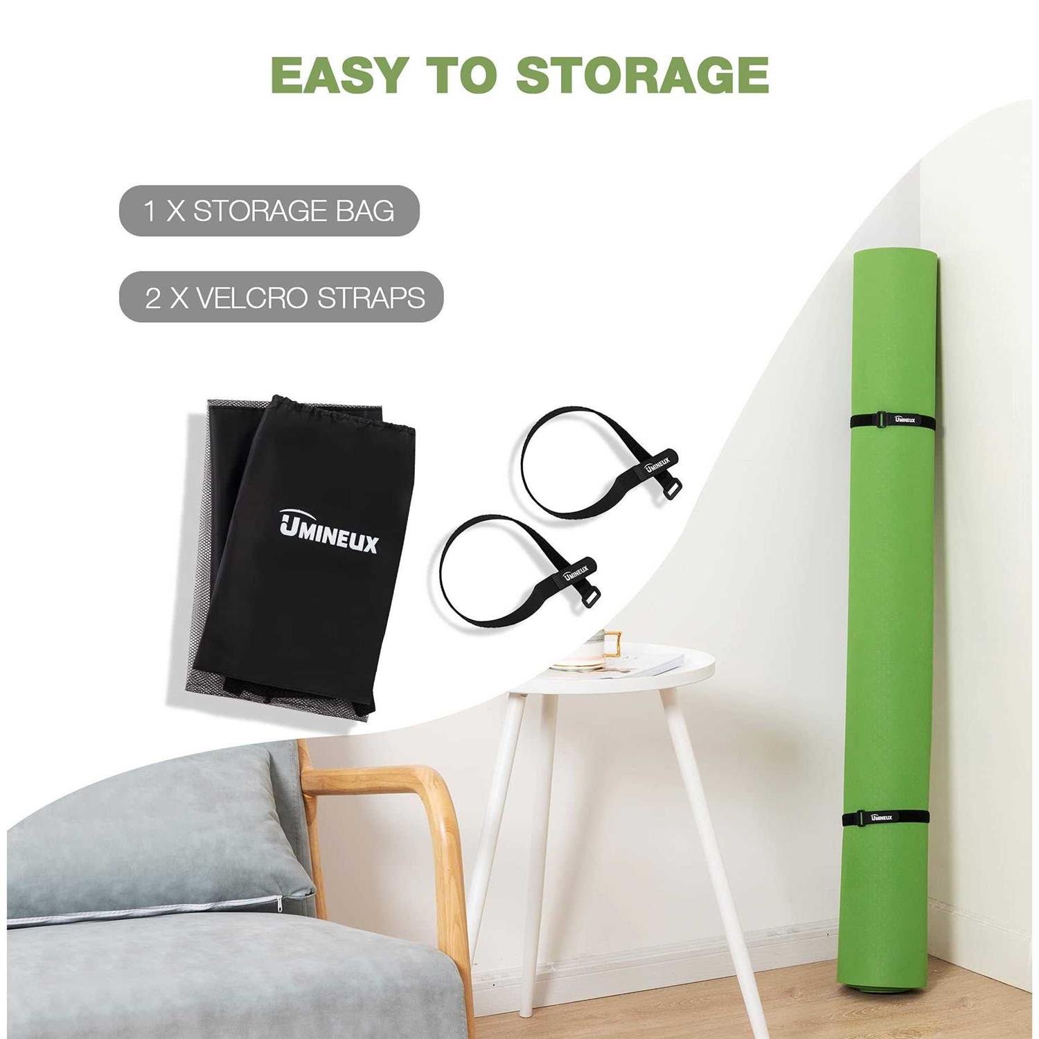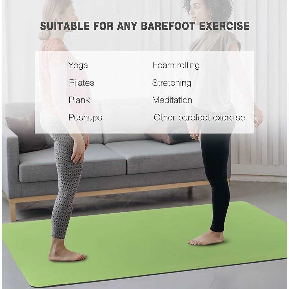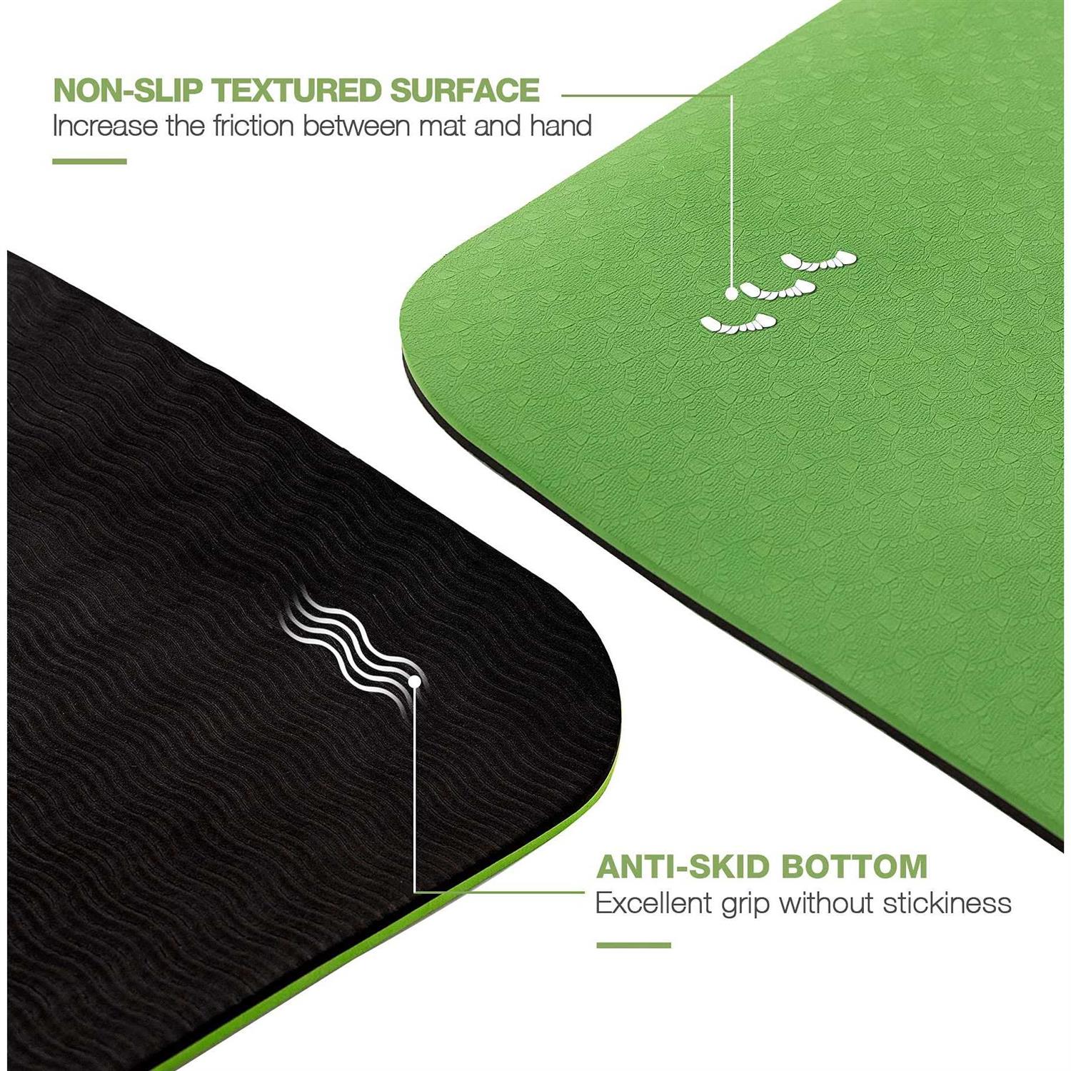 DIMENSIONS: 6’x4’x6mm. This big yoga mat is double the standard-size, which is large enough for you to change directions without falling off the mat. Transforming your space into a perfect workout area. DOUBLE NON-SLIP DESIGN – This workout mat has double-sided non-slip surfaces. Wavy undersides make excellent traction on the floor. It unrolls pretty flat and stays put. Special textured surface prevents your hands and feet from sliding. ECO-FRIENDLY TPE MATERIAL – Our yoga mat is made from premium quality material TPE (Thermoplastic elastomers), which is phthalate free, more soft, skin-friendly, light weight and recyclable. COMBINING COMFORT AND BALANCE – Thicker mats sacrifice stability and thinner mats sacrifice cushioning on your joints. Due to a high density TPE material, this 6mm thick pad strikes a balance between stability and cushioning (There is an option that is 8 mm thick but 24 inches wide in our store for those who have high requirements for cushioning). EASY TO STORAGE – This spacious yoga mat can be placed in any corner of your room with the included 2 Velcro Straps and a Storage Bag.