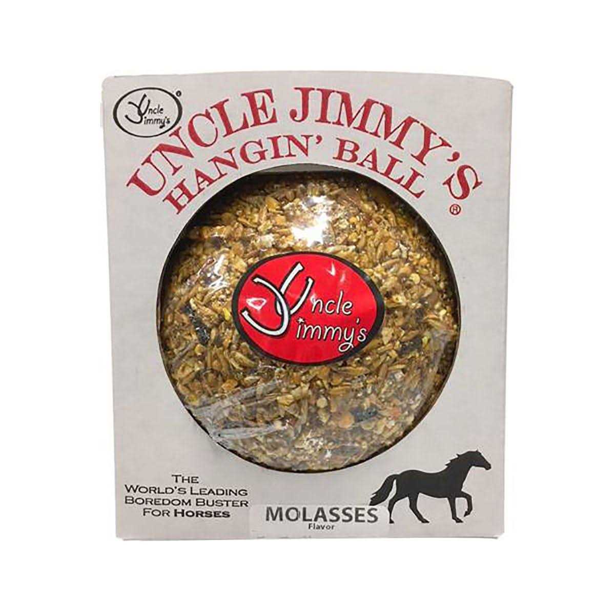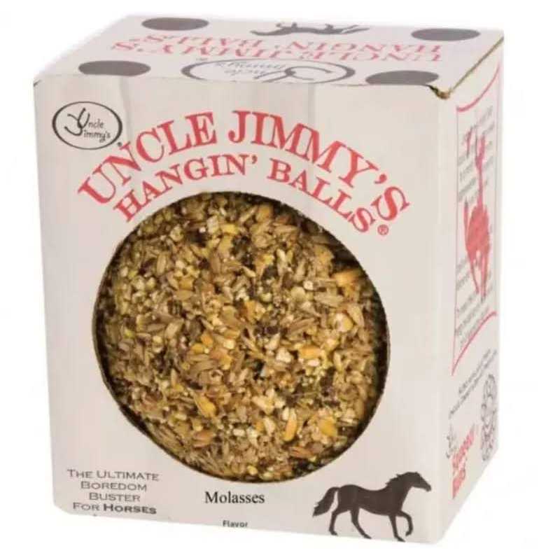 Half horse treat, half toy, 100% fun! Uncle Jimmy’s Hangin’ Balls are the perfect way to reduce your horse’s boredom in their stall or run-in shed. Your horse will spend hours trying to lick and bite the delicious ball, providing them (and you!) with copious amounts of entertainment. But this treat is more than fun! It is also packed with vitamins and minerals that are essential for your horse’s daily dietary needs! Available in many delicious flavors, including molasses, carrot, and apple. It also comes in a No-Sugar Added option, making it a perfect treat for horses with sugar intolerances, insulin resistance, or Cushing’s disease. The durable cotton loop makes it easy to hang from the ceiling in your horse’s stall. Hang at or slightly above wither level for best results. Half horse treat, half toy Delicious flavor Packed with vitamins and minerals Durable cotton loop for hanging 3.5 lb.