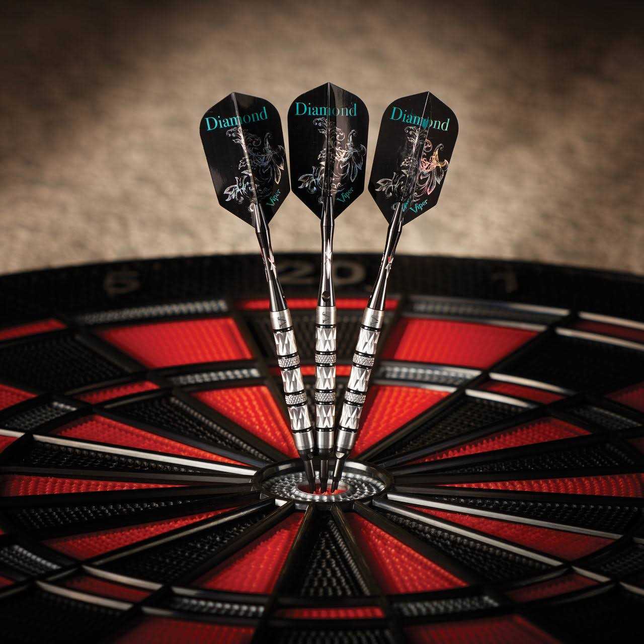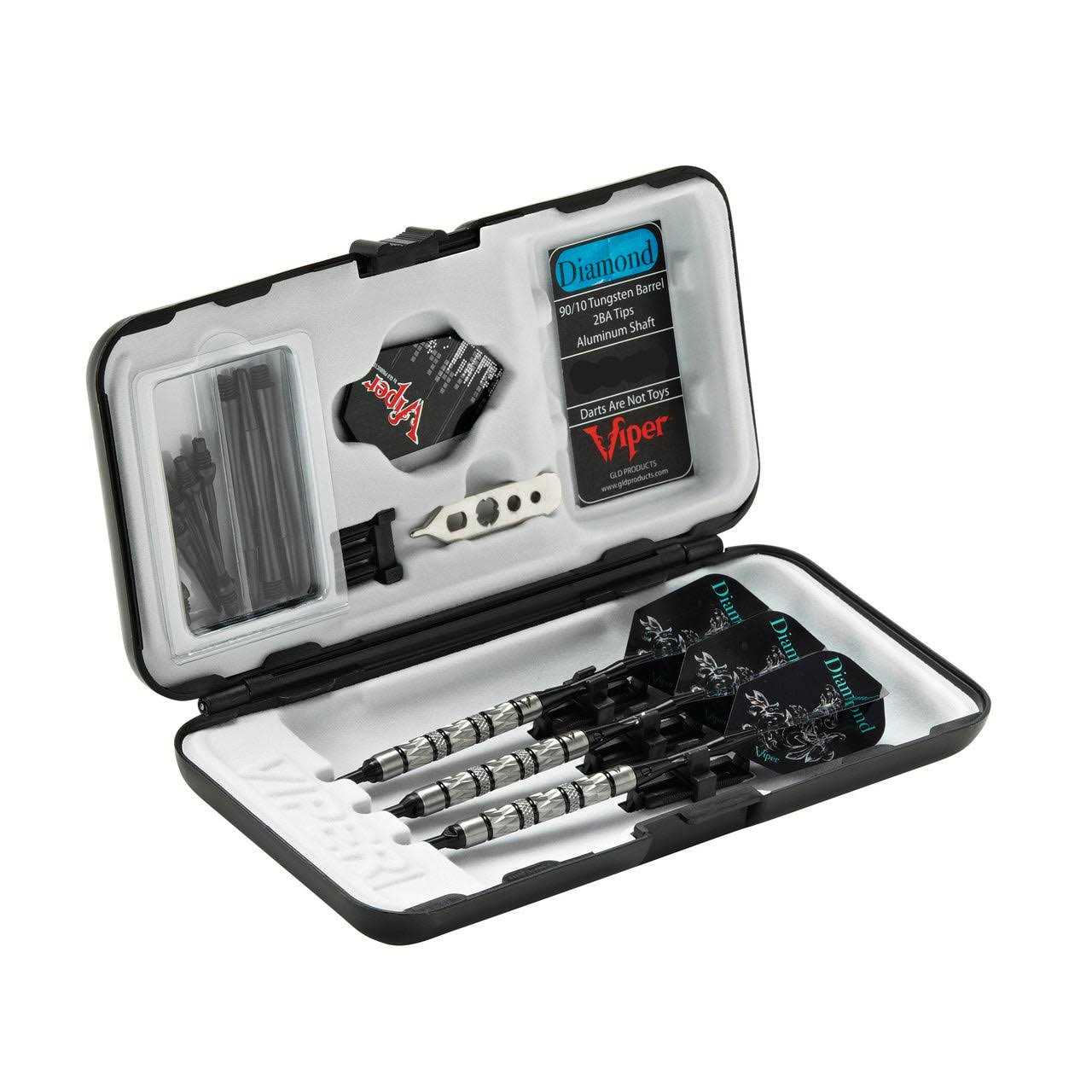 Your dart game will shine when you shoot with these gems. The high-quality Viper Diamond Soft-Tip Darts feature 90% tungsten and 10% nickel barrels in a slim profile to provide exceptional balance and deliver tighter grouping shots without sacrificing control. Each barrel boasts strategically placed knurled bands, diamond-cut inscriptions and hand-painted rings for a superior and consistent grip, throw after throw. The sturdy, lightweight aluminum shafts have diamond-cut etchings for a fierce look and locking holes for a more secure fit, reducing the need to re-tighten the shafts after a few shots. Each slim flight is finished with flashy holographic designs. These darts work with electronic or most sisal dartboards. Set includes 6 flights, 3 extra nylon replacement shafts, 6 2BA Tufflex II tips, a dart mechanic repair tool, 3 flight protectors and a Deluxe Dart Pal hardcover case to organize and protect your darts. Color: black.