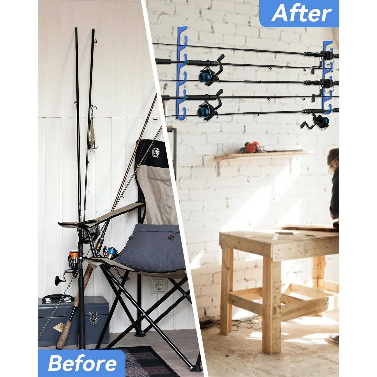 Ideal for Various Fishing Rods. The WellMall fishing pole holders for garage with 1.34 inches diameter rod slots, meticulously designed to accommodate all types of fishing rods – from spinning rod to casting rod, surf rod to fly fishing rod, ensuring they stay neatly organized, and ready for action whenever your fishing itch strikes. Uncompromising Rod Protection. The grooves of fishing rod rack wrap around the PVC protective cover, act like knights in shining armor for your rods, shielding them from accidental bumps and bruises. No more worries about unsightly scratches, dings, or damage – your prized rods will remain in pristine condition, season after season. Alloy Steel Material, Built to Endure. Crafted from premium and durable materials, this fishing rod storage rack can comfortably handle the weight of 5 rods collection. It’s a robust, long-term investment in your angling passion that will serve you faithfully for years to come. Organization & Accessibility at Its Best. The WellMall fishing pole rack can hold up to 10 rods in less than 34″ wall space. With our racks, your fishing rods are elegantly organized and always within arm’s reach, never waste a moment fumbling for your favorite rod again! Easy as Pie Installation in Just 4 Steps. Ain’t nobody got time for complicated setups! Our user-friendly installation process is as breezy as a day on the water. In just four simple steps, you’ll have your fishing pole holder up on the wall or ceiling, freeing up your precious time for more casts.