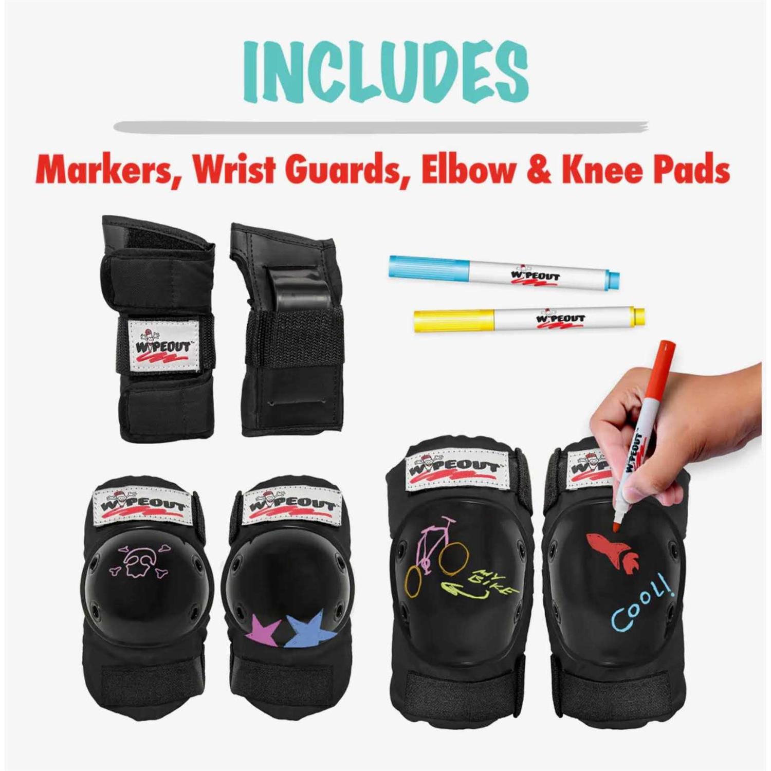 Pads feature tough, abrasion-resistant nylon body and impact-resistant cap anchored with reinforced rivets for increased durability. Lightweight and contoured knee and elbow pad design with shock-absorbing EVA foam provides protection without sacrificing mobility. Wrist guards feature impact-resistant molded splints positioned on top and bottom of wrists with EVA foam cushioning for maximum protection. Includes one pair each — knee, elbow and wrist pads; and two dry-erase non-toxic markers.