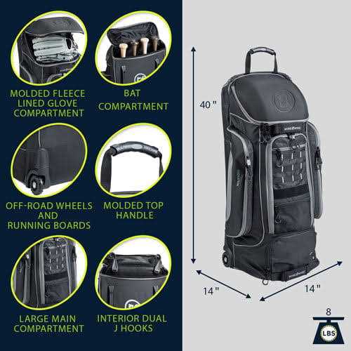 Bat compartment holds up to 4 bats in individual bat sleeves Large main compartment designed to comfortably fit all your gear Ventilated footwear storage compartment with zip-off panel for embroidery Off-road wheels and running boards provide stability and toughness for any terrain Hook-and-loop tape on exterior provides convenient access to batting gloves Wire2Wire Tournament Catcher’s Wheeled Bag – Features * Bat compartment holds up to 4 bats in individual bat sleeves * Large main compartment designed to comfortably fit all your gear * Ventilated footwear storage compartment with zip-off panel for embroidery * Off-road wheels and running boards provide stability and toughness for any terrain * Hook-and-loop tape on exterior provides convenient access to batting gloves * 2 exterior neoprene handles for easy transport and extra comfort * Elastic looping system for added storage and organization * Molded top handle for easy transport and extra durability * Zippered waterproof fleece-lined valuables pocket * Insulated HYDRATION pocket with drain vents * Large side pocket with interior zippered storage * Interior dual J hooks for convenient hanging * Zippered mesh pocket for additional storage * Interior padding to help keep bats protected * Material: * Main Body: High density 600D polyester * Inner Lining: Poly 201D * Overall Dimensions: 40″ H x 14″ W x 14″ D * Main Compartment: 31″ L x 9″ W (with 18″ L x 9″ W opening) * Weight: 8.0 lbs Fleece-Lined Glove Compartment – Molded fleece-lined glove compartment stores and protects your glove. – Bat Compartment – Bat compartment holds up to 4 bats in individual bat sleeves. – Footwear Storage Compartment – Ventilated footwear storage compartment with zip-off panel for embroidery. – Wire2Wire, offered exclusively at Baseball From pre-season workouts and practices to the final game, start out strong and finish the season at the top of the standings when you put yourself and your team at a competitive advantage going Wire2Wire.