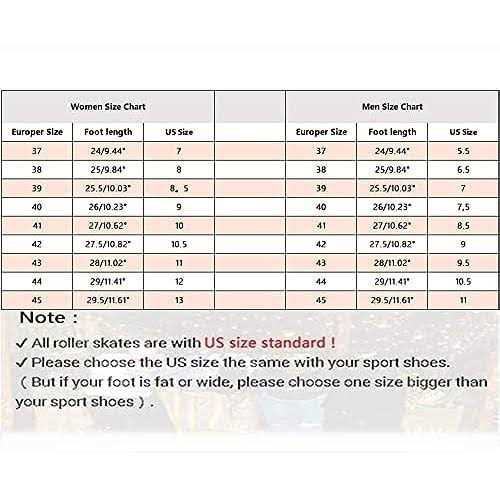 【Extraordinary Comfort】 The adjustable shoelace design can be adjusted to the most comfortable state. The leather and lining of the upper are soft and comfortable, and have excellent durability. 【Easy to Master】 Classic double-row skates are safer than in-line skates, and are equipped with wheels with ABEC 5 bearings, which are fast and stable. They are suitable for young people, adults and beginners, as well as men and women who want to learn roller skating easily. Master and experience the fun of roller skating in a short time. 【Safe and Durable】 High-top Roller Skates are made of durable molded materials, with a strong chassis and durable brake stoppers, which can better maintain control and fast braking, which can protect your driving experience. 【Ideal Gift】 PU Leather skates are an ideal gift for kids, teenagers and adults. Suitable for indoor and outdoor skating. You don’t have to wait too long to receive the package. Please rest assured to buy! Product Specifications: -Fabric: PU leather -Closure: drawstring laces -Wheels: four PU wheels -Weight: 3000G Size Chart: WOMEN SIZE CHART: Our Size — Heel To Toe——-US Size(Women) 37———23.5cm/ 9.25″——–US: 6 38——–24cm/9.45″——–US: 6.5 39——–24.5cm/9.65″——–US: 7 40——–25cm/9.84″——–US: 7.5 41——–25.5cm/10.1″——–US: 8 42——–26cm/10.24″——–US: 8.5 43——–26.5cm/10.43″——–US: 9 44——–27cm/10.63″——–US: 10 45——–27.5cm/10.82″——–US: 11 MEN SIZE CHART: Our Size — Heel To Toe——-US Size(Men) 37———23.5cm/ 9.25″——–US: 5 38——–24cm/9.45″——–US: 6 39——–24.5cm/9.65″——–US: 6.5 40——–25cm/9.84″——–US: 7 41——–25.5cm/10.1″——–US: 7.5 42——–26cm/10.24″——–US: 8 43——–26.5cm/10.43″——–US: 8.5 44——–27cm/10.63″——–US: 9 45——–27.5cm/10.82″——–US: 10 Note: -Due to the difference in display and lighting, the picture may not reflect the actual color of the product.